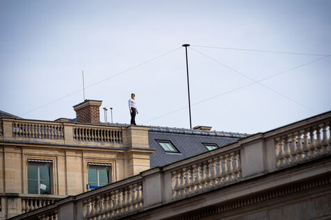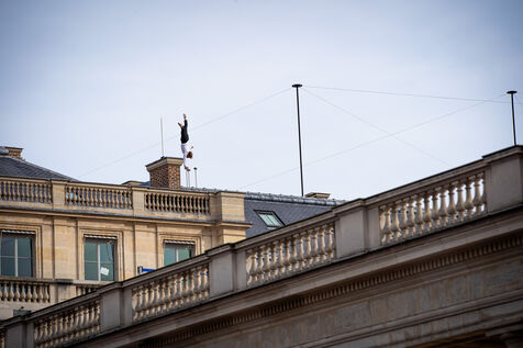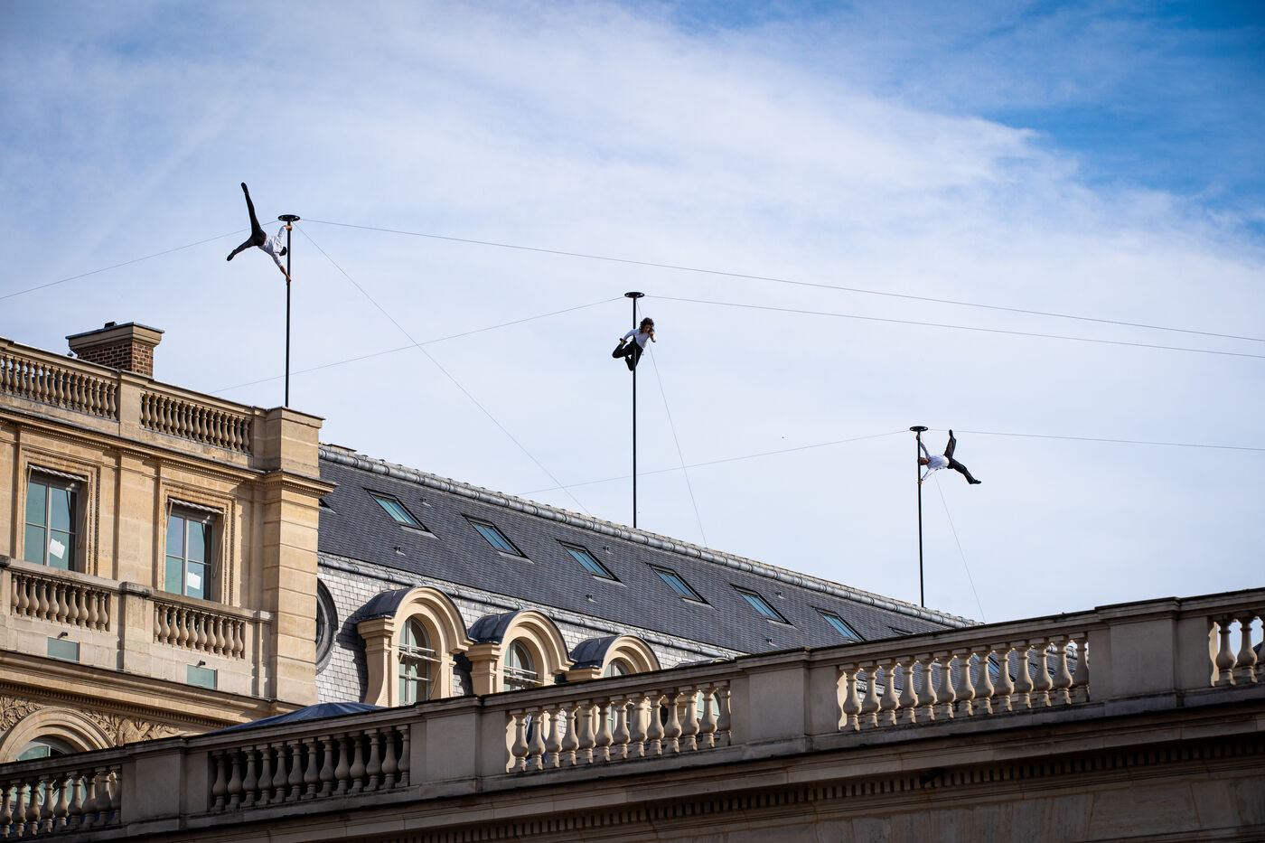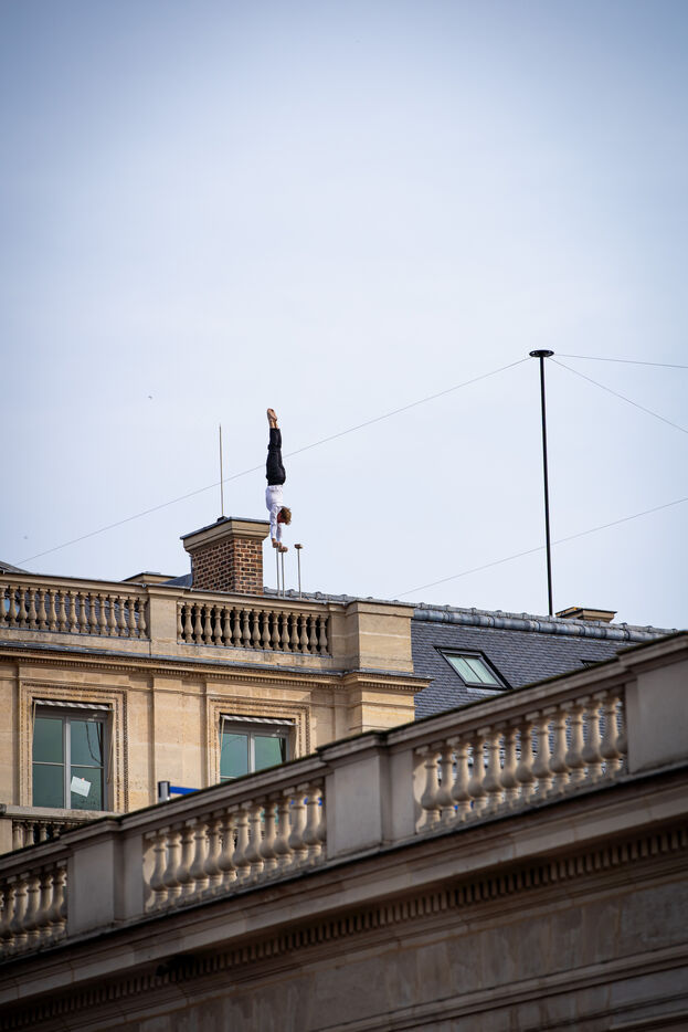 At the Palais Royal, Compagnie l'Oubliée's acrobatic show Horizon takes over the roofs and terraces of the Cour d'Honneur for an extraordinary spectacle. On the occasion of the Cultural Olympiad (part of the Olympic Games JO PARIS 2024) and the European Heritage Days, the show sold out several hours in advance. Many people were only able to catch a glimpse of the acrobats from the gardens. Sunday, September 17, 2023.