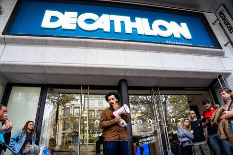 Rally and picket in front of the Decathlon Paris La Madeleine store following the death of a young temporary worker in a work accident involving a forklift truck on his first day on the job on Wednesday, October 11. Left-wing politicians, unions, staff, colleagues and shop stewards had been denouncing the harshness of their working conditions for years. Friday, October 13, 2023.