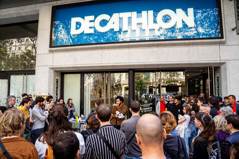 Rassemblement et piquet de grève devant le magasin Decathlon Paris La Madeleine suite à la mort d'un jeune intérimaire, accident du travail avec un chariot élévateur son premier jour de mission le mercredi 11 octobre. Elus de gauche, syndicats, personnel, collègues, délégués syndicaux dénonçaient depuis des années la pénibilité de leurs conditions de travail. Vendredi 13 Octobre 2023.