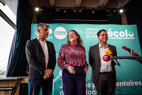 Mid-day press conference for the Ecologists' Parliamentary Days at Dock B in Pantin. Speeches by Cyrielle Chatelain, Guillaume Gontard and Mounir Satouri. The ecologist members of the National Assembly, Senate and European Parliament take stock and reflect together on the political situation. Topics covered: the launch the following day of the new Les écologistes movement, the conflict between Israel and Palestine following the Hamas terrorist attacks, the position on Nupes, the death that very morning of a teacher in Arras... Friday, October 13, 2023.