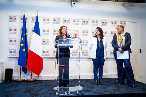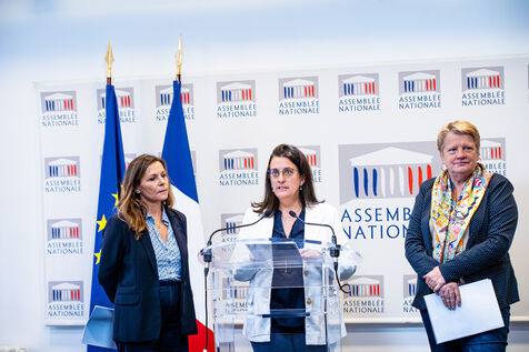 Presentation by deputies Perrine Goulet (Democrat Modem and Independents, Dem), Michèle Peyron (Renaissance, Presidential Majority, RE) and Isabelle Santiago (Socialist, SOC, Left), rapporteurs, of the report by the French Delegation for Children's Rights on the outlook for childcare in daycare centers. Topics covered: parental leave, neuroscience for the study of child development. Press conference at the French National Assembly, Paris, Tuesday November 14, 2023.