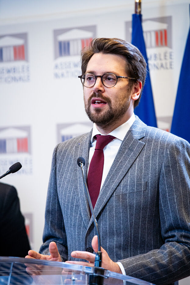 Presentation by the Ecologist deputies of the proposal by the Ecologist group (Nupes) of the motion for prior rejection of the bill to control immigration, improve integration (pjl immigration asile 2023). Press conference at the French National Assembly. Monday, December 11, 2023.