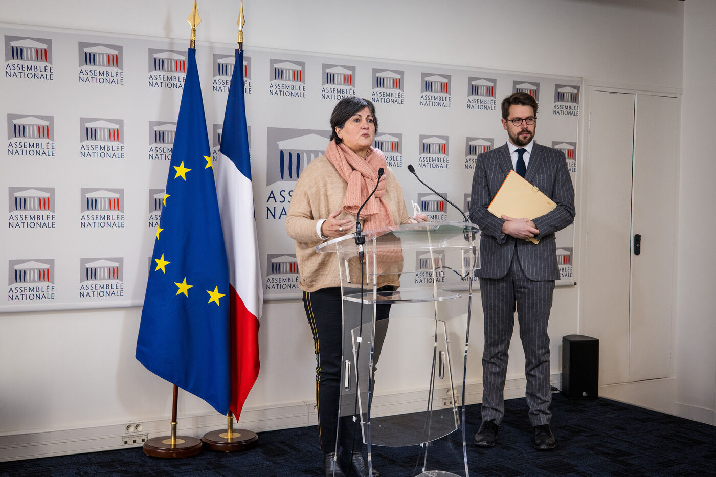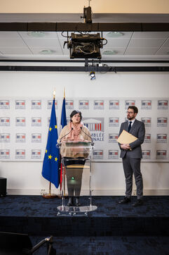 Conférence de presse des groupes parlementaires dans la Salle des conférences de presse de l'Assemblée Nationale. Députés Christine Arrighi et Benjamin Lucas (porte parole) du groupe écologiste (Les Ecologistes - EELV), mardi 16 janvier 2024. Sujets abordés : droit de tirage pour commission d'enquête sur le montage juridique et financier du projet d'autoroute A69, projet de loi immigration, remaniement ministériel / nouveau gourvernement...