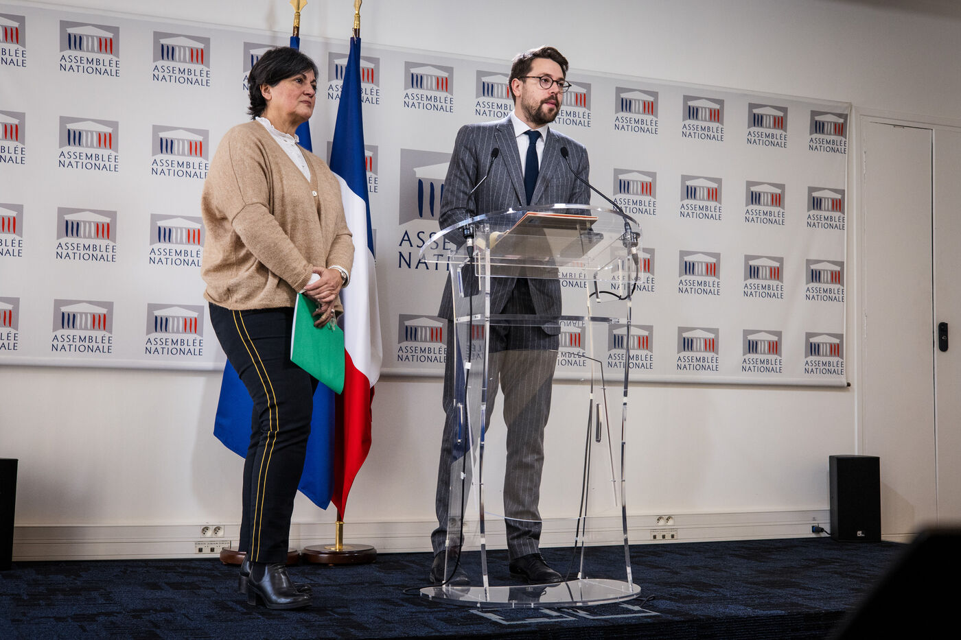 Parliamentary group press conference in the National Assembly press conference room. Deputies Christine Arrighi and Benjamin Lucas (spokesman) of the ecologist group (Les Ecologistes - EELV), Tuesday January 16, 2024. Topics: drawing rights for a commission of inquiry into the legal and financial set-up of the A69 freeway project, immigration bill, ministerial reshuffle / new government...