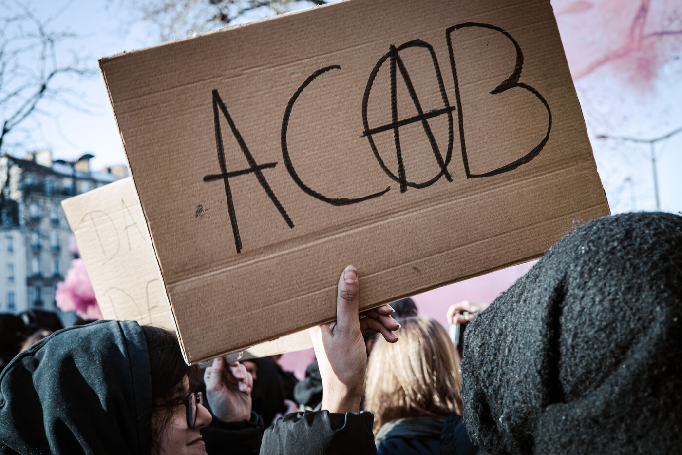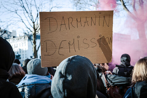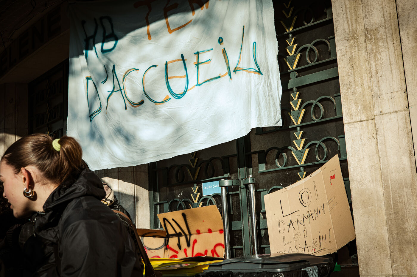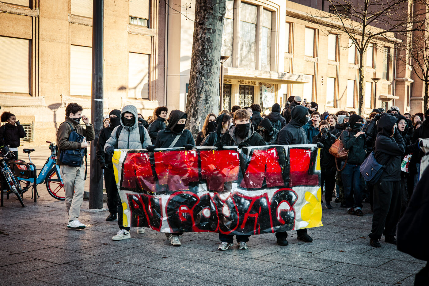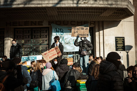 Rassemblement devant le lycée Hélène Boucher dans le 20e arrondissement après blocus de plusieurs lycées parisiens le matin, suivi d'une manifestation sauvage des lycéens et lycéennes jusqu'au centre de Paris. Contre les lois racistes du gouvernement (contre la loi immigration), contre la politique et les mensonges de la nouvelle ministre de l'éducation nationale, pour plus de moyens pour l'école publique. Jeudi 19 janvier 2024.