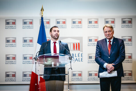 Presentation by deputies Roger Chudeau (RN deputy) and Julien Odoul (RN deputy) of the conclusions of the parliamentary commission of inquiry into failings in the French sports movement. The report condemns sexist and sexual violence in sport, the omerta and self-involvement of sports federations, and targets the Ministry of Sport's Signal-sports platform. Platform of the Balance ton sport commission. Rassemblement National (RN, extreme right) group, press conference room at the French National Assembly. Tuesday, January 23, 2024.