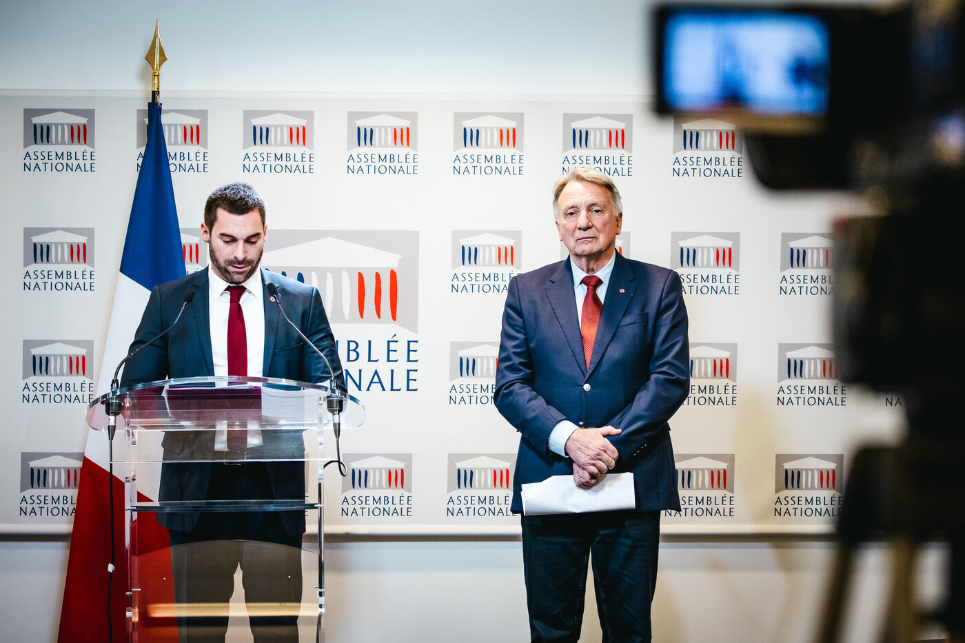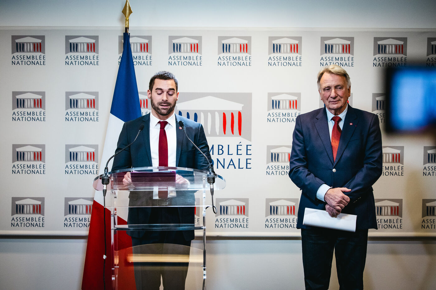 Présentation par les députés Roger Chudeau (député RN) et Julien Odoul (député RN) des conclusions de la commission d'enquête parlementaire sur les défaillances dans le mouvement sportif français. Le rapport dénonce les violences sexistes et sexuelles VSS dans le sport, l'omerta, et l'entre soi des fédérations sportives et cible la plateforme du ministère des sports Signal-sports. Plateforme de la commission Balance ton sport. Groupe Rassemblement National (RN, extreme droite), salle des conférences de presse de l'assemblée nationale. Mardi 23 janvier 2024.