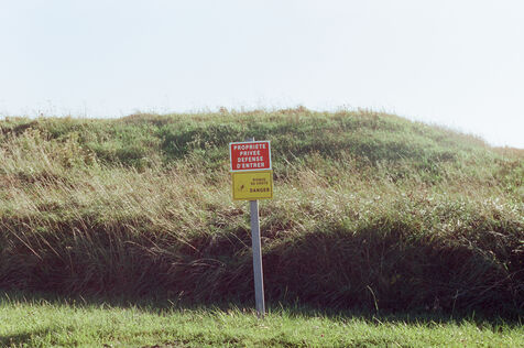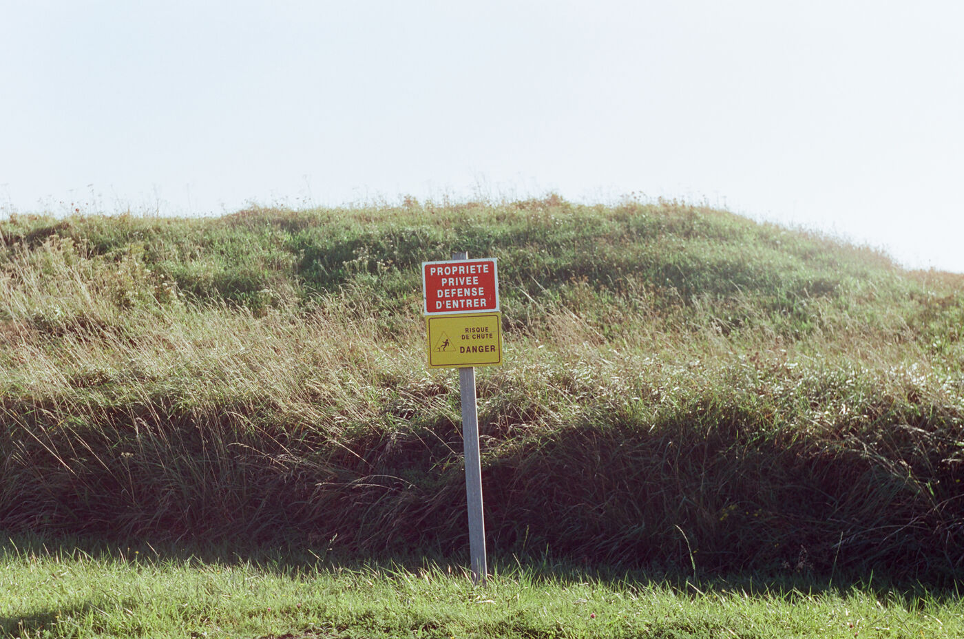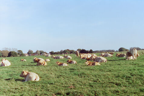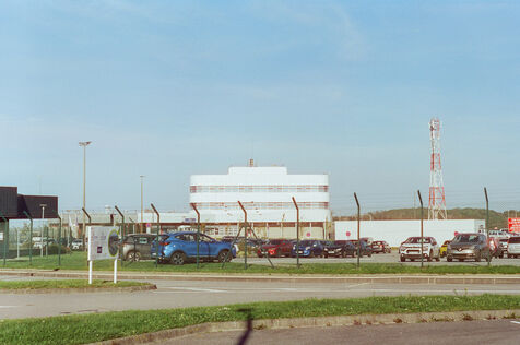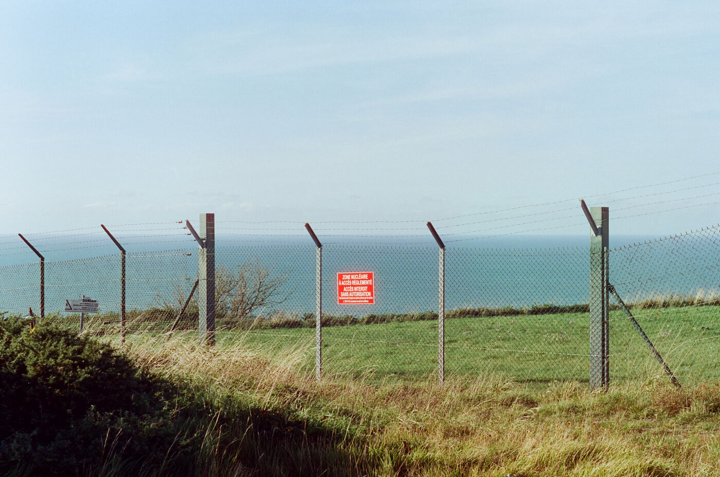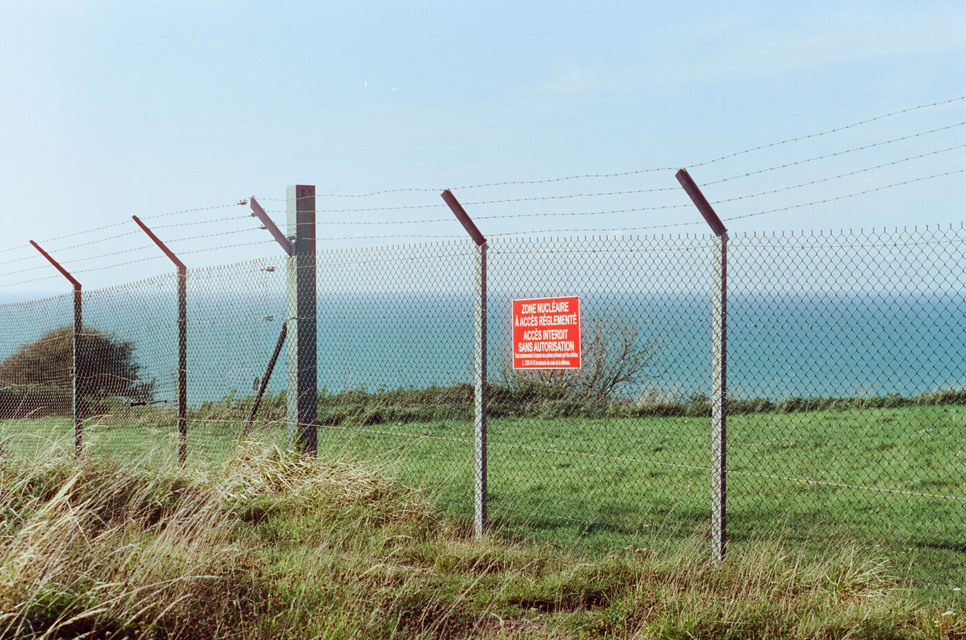 Surrounding the Penly nuclear power plant, located in the commune of Petit-Caux on the English Channel coast (reactors cooled by water from the English Channel). The site has been selected for the construction of new EPRs starting in 2024 (EDF's EPR2 project). Photo taken in October 2023 along the safety fence, with fields and animals on one side and parking lots and access to the power plant on the other. Film photography, Zenit-TTL camera, Sunbath 250D cinema film.