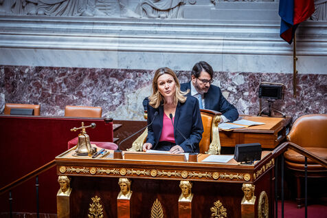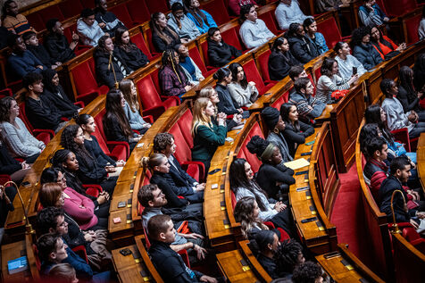 Theatrical re-enactment of the "Europe, Europe, Europe!" debates on the ratification of the Treaty of Rome, which took place in the Chamber in July 1957. Session organized by the President of the French National Assembly on the occasion of the 2024 European elections to raise awareness of European treaties and the values of the European Union among young people. The deputies are played by professional actors. Palais Bourbon, Paris, Monday February 26, 2024.