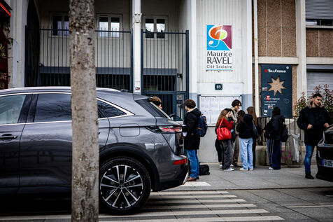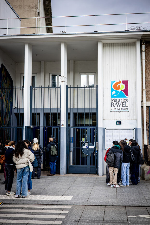Déplacement de Nicole Belloubet, ministre de l'éducation nationale et de la jeunesse, au lycée Maurice Ravel (Cité scolaire, Paris, 20e arrondissement), accompagnée du préfet de police Laurent Nunez et de Valérie Baglin-Le Goff, directrice de l'académie de Paris. Micro tendu à l'issue de l'entretien de la ministre avec le proviseur de l'établissement scolaire suite à des menaces qu'il a reçues. Il est menacé de mort sur les réseaux sociaux suite à une altercation avec une élève de BTS à qui il a demandé de retirer son voile (respect de la laïcité). Port du voile, plainte et accusations de violences dans l'école publique et laïque. Mardi 5 Mars 2024.