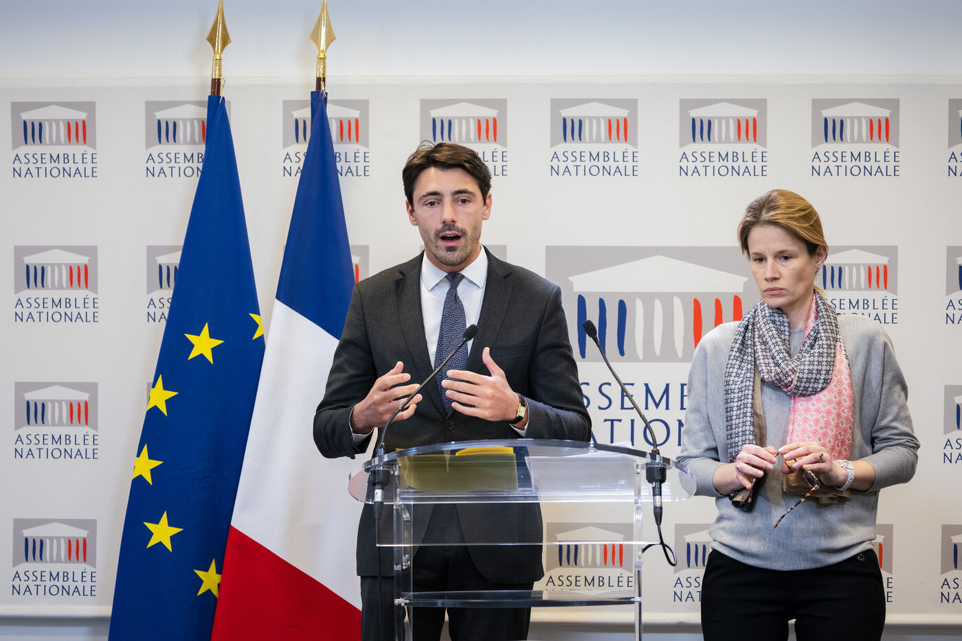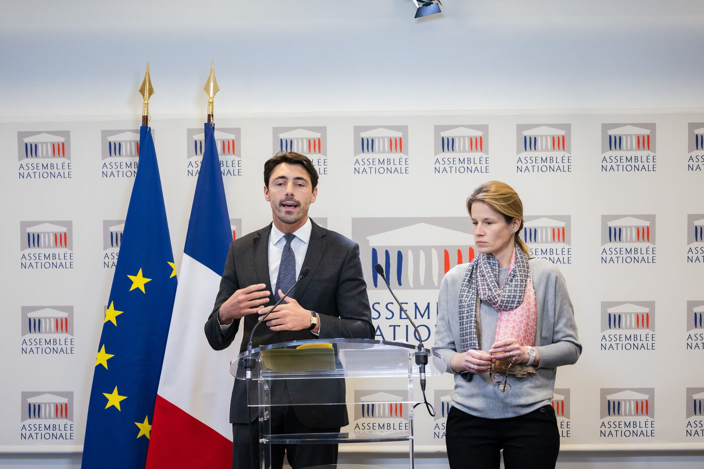 Press conference by members of the presidential majority. Press briefing by Anne-Laure Babault (MP, Modem Democratic Group) and Alexis Izard (MP, Renaissance) on the mission requested by the government to evaluate the law of October 18, 2021 aimed at protecting farmers' remuneration, known as the Egalim 2 law. They reiterated several times that the aim was not to create an Egalim 4 law. National Assembly press conference room, Wednesday March 13, 2024.