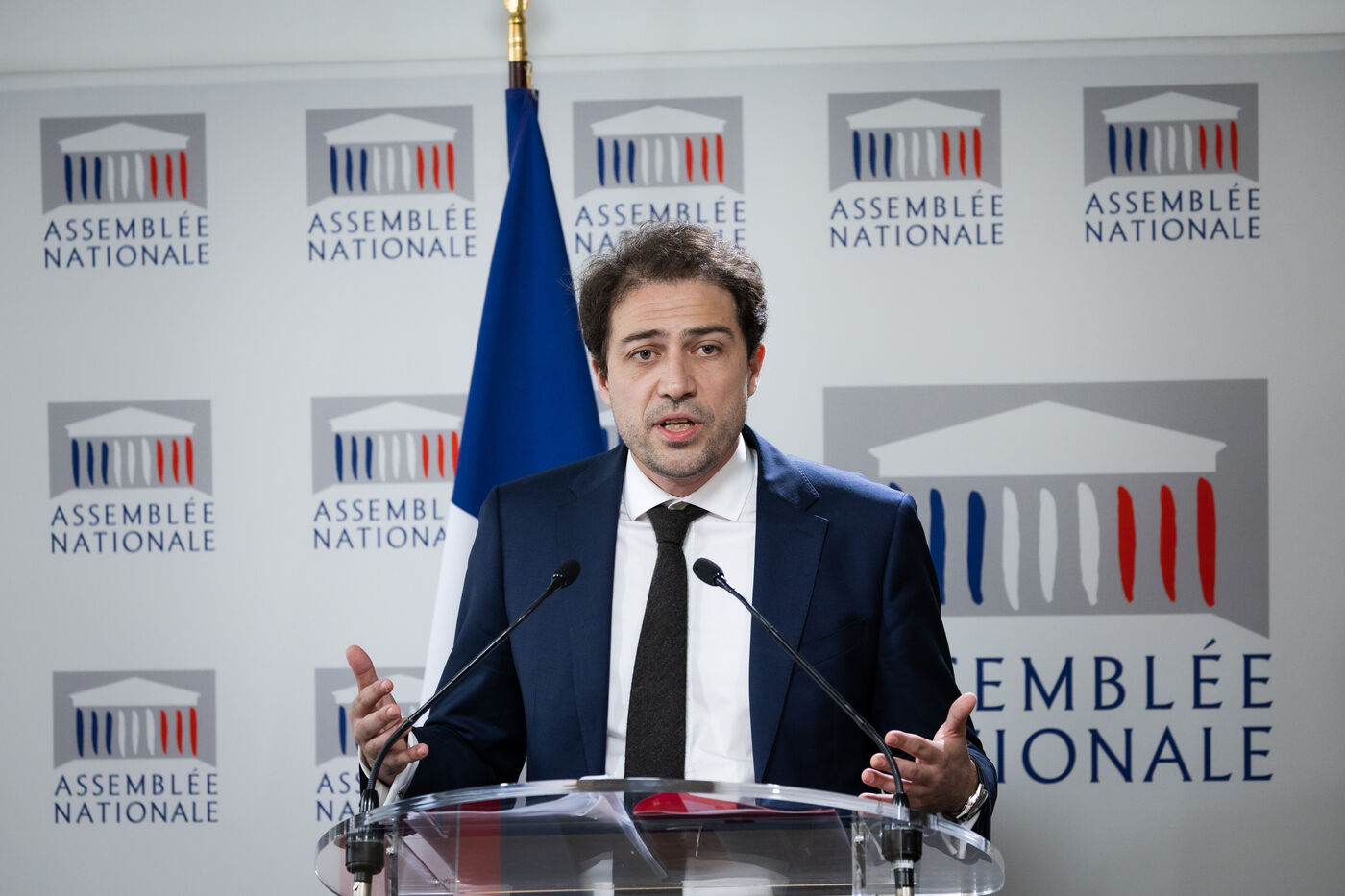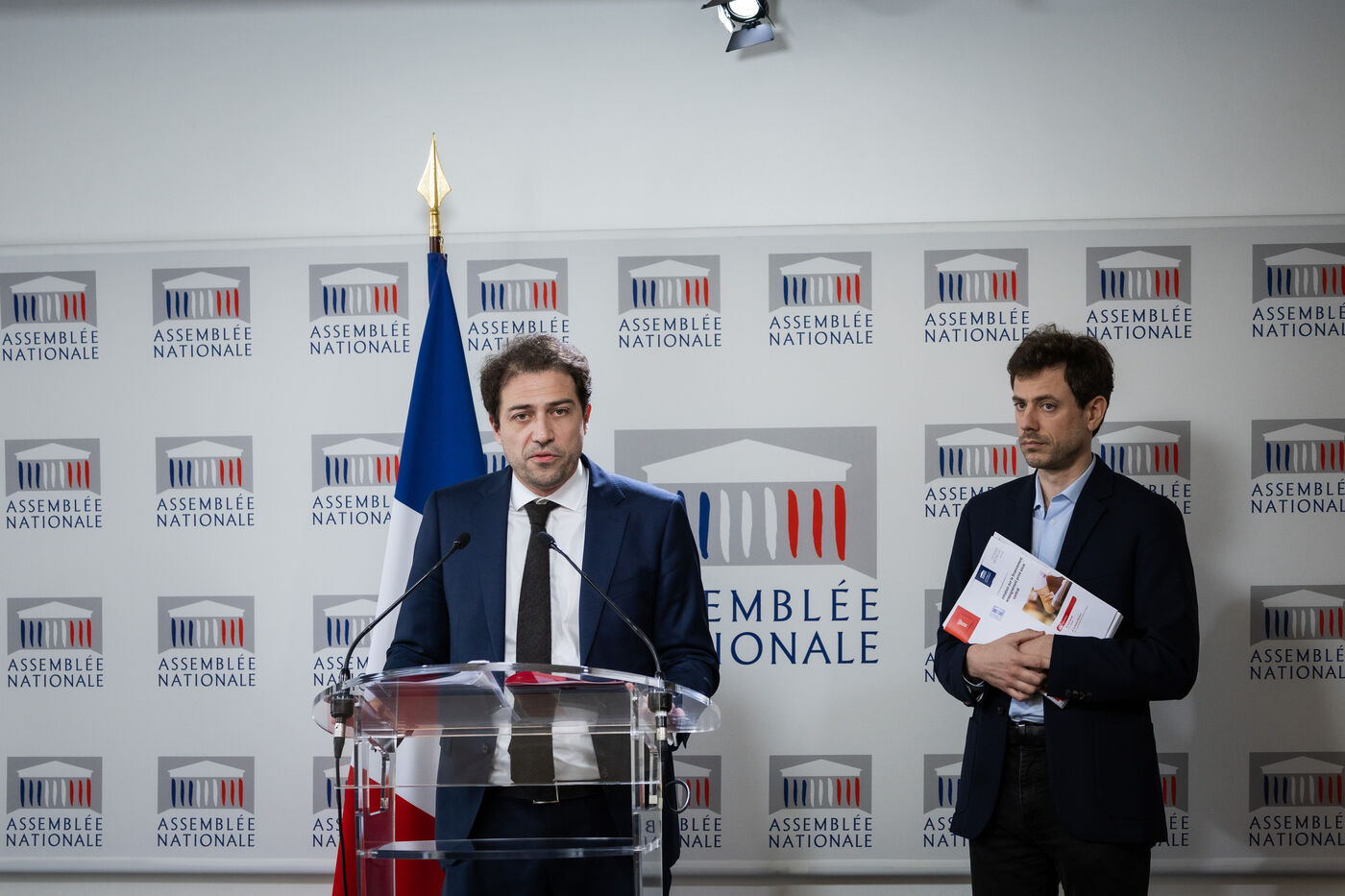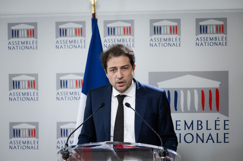 Presentation by Paul Vannier (LFI-NUPES MP) and Christopher Weissberg (Renaissance MP), rapporteurs of the report by the information mission on state funding of private education under contract at a press conference at the National Assembly in Paris, France on April 3, 2024. Conclusions of the cross-party mission of deputies from the Commission for Cultural Affairs and Education on state funding of private schools, the report includes 55 proposals for improvements or controls to be put in place.