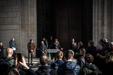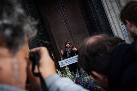 Inauguration de la façade restaurée de l'Eglise de la Madeleine dans le 8e arrondissement à Paris, France, le 3 avril 2024. Ce chantier de restauration et de remise en valeur d'une église emblématique de Paris se place dans le cadre du plan de restauration des édifices culturels impulsé en 2015 par la maire de Paris.
