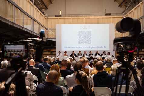 Réunion publique sur les dispositifs de sécurité (QR code, zones avec accès interdit autour des sites olympiques et le long de la seine pour la cérémonie d'ouverture) mis en place lors des Jeux Olympiques et Paralympiques JOP 2024 au Pavillon de l'Arsenal à Paris, France le 07 Juin 2024. En présence d'élus de la ville de Paris, de membres du comité d'organisation des JO COJOP, de membres du gouvernement et de commerçants parisiens et représentants de fédérations du secteur du commerce et les acteurs du tourisme (nécessité de réservation pour les clients des commerçants, restaurants et hotels).