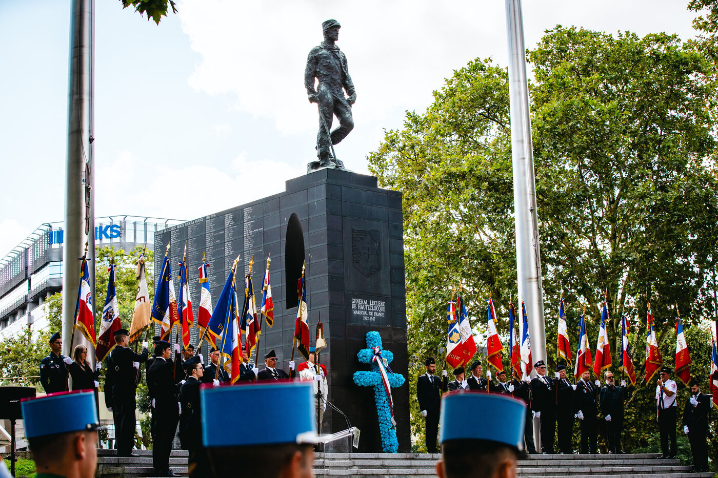 Military ceremony to commemorate the 80th anniversary of the liberation of Paris, in honor of the 2nd Armored Division (2e DB) and General Leclerc, in front of the statue of General Leclerc de Hauteclocque, Marshal of France, Porte d'Orleans, Paris, France, on August 25, 2024. The liberation of Paris during the Second World War took place from August 19 to 25, 1944, marking the end of the Battle of Paris.