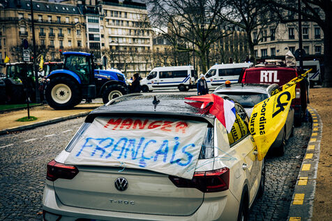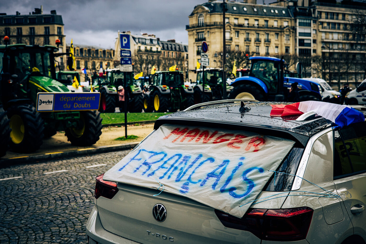 An angry demonstration by farmers and peasants from the Coordination Rurale farming union on the eve of the 60th International Agriculture Fair (Salon International de l'Agriculture SIA), a convoy of tractors set up on Place Vauban behind Les Invalides in Paris, France on February 23, 2024. Farmers across Europe have been protesting for weeks over what they say are excessively restrictive environmental rules, competition from cheap imports from outside the European Union and low incomes.
