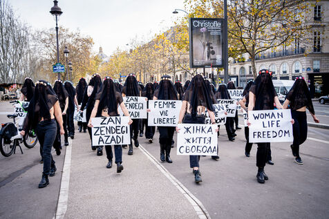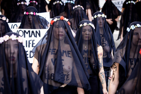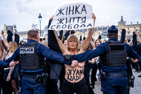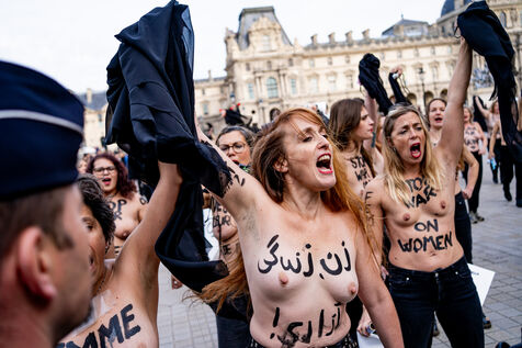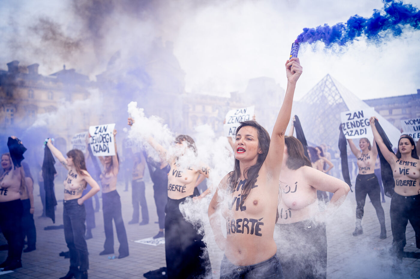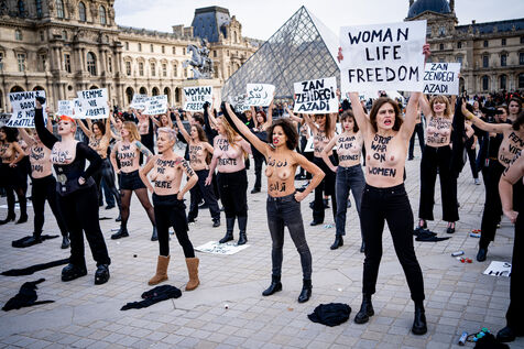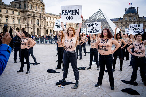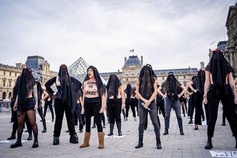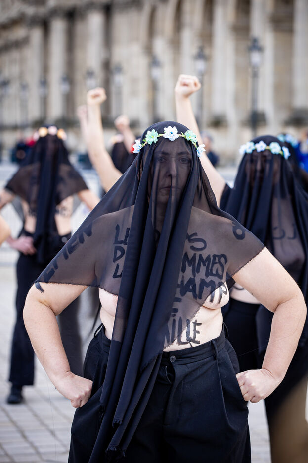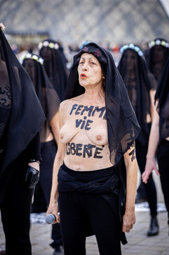 A major action by FEMEN activists, bringing together around a hundred women demonstrators from all over the world to lift the veil against violence against women throughout the world and particularly in the Middle East, in front of the Louvre Pyramid in Paris, France on November 24, 2024.