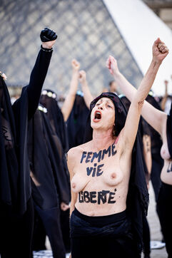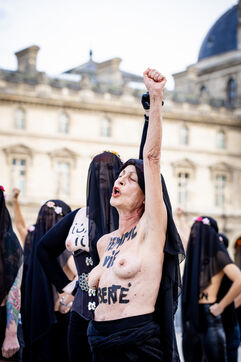 Grande action des activistes FEMEN regroupant une centaine de femmes manifestantes venues de partout pour lever le voile contre les violences faites aux femmes dans le monde entier et en particulier au Moyen Orient, devant la pyramide du Louvre à Paris, France le 24 Novembre 2024.