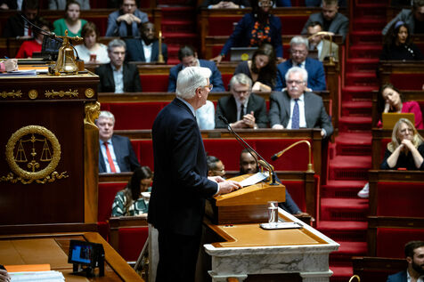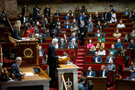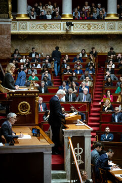 Examination of the report of the Joint Committee on the Social Security Finance Bill for 2025 (PLFSS, budget) at the French National Assembly in Paris, France on December 2, 2024. Use of Article 49.3 of the Constitution by the Prime Minister, who commits the responsibility of his government and exposes himself to motions of censure (motion of no confidence / motion to dismiss) from the left and far right.