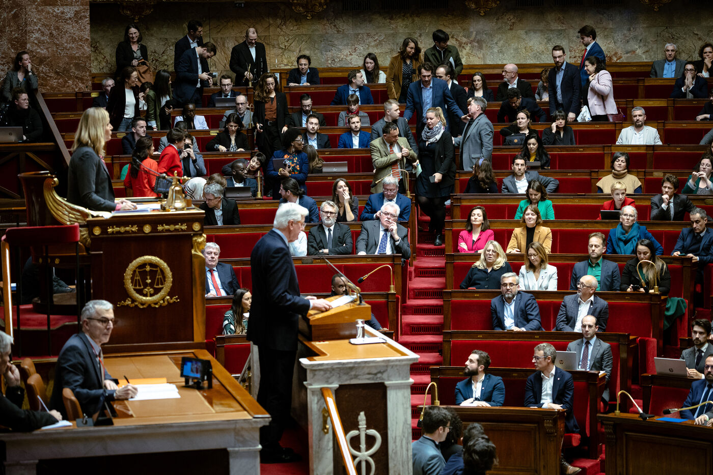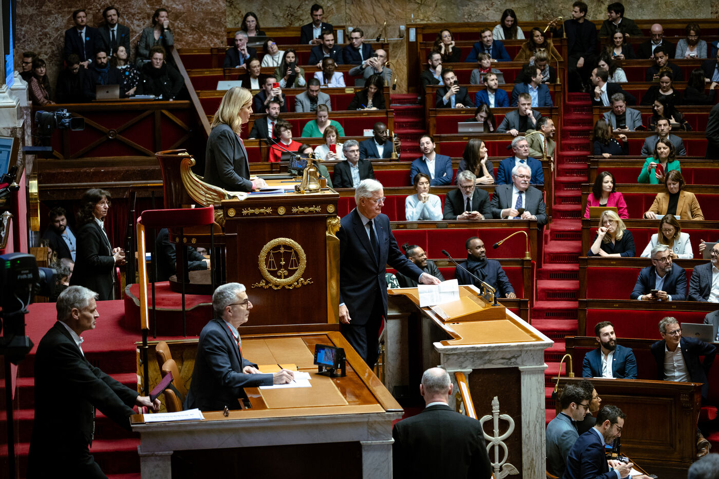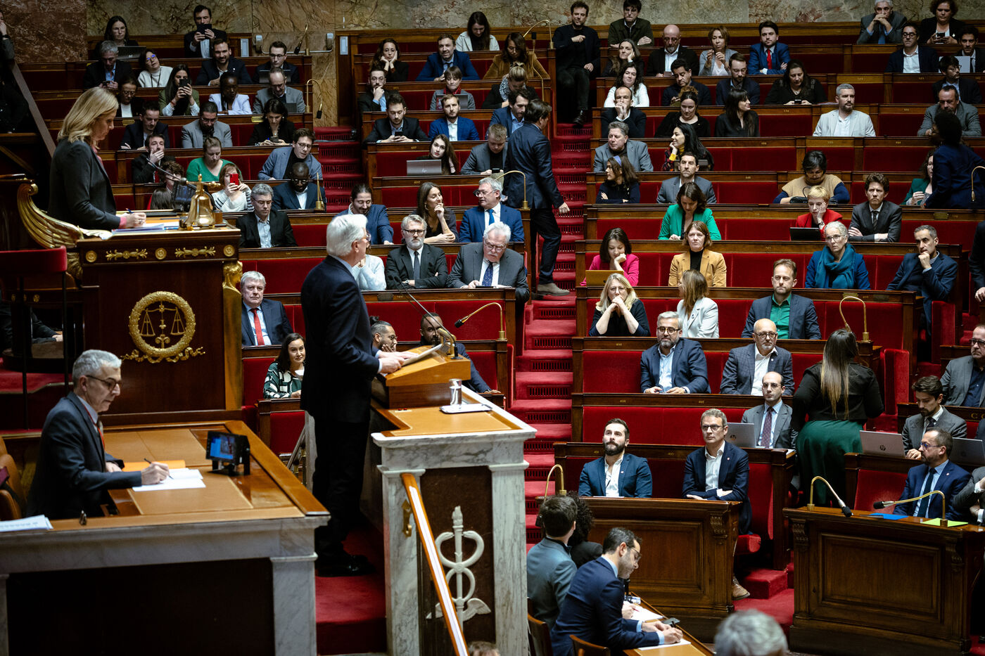 Examen en séance du rapport de la commission mixte paritaire CMP sur le projet de loi de finances de la sécurité sociale pour 2025 (PLFSS, budget), à l'Assemblée Nationale à Paris, France le 2 Décembre 2024. Utilisation de l'article 49.3 de la constitution par le premier ministre qui engage la responsabilité de son gouvernement et s'expose à des motions de censure par la gauche et l'extrême droite.