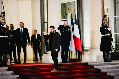 France's President Emmanuel Macron welcomes United States President-elect Donal Trump and Ukraine's President Volodymyr Zelensky for a series of bilateral talks that have become trilateral talks, arriving and departing in the Main Courtyard of the Presidential Palace in Paris, France on December 7, 2024.