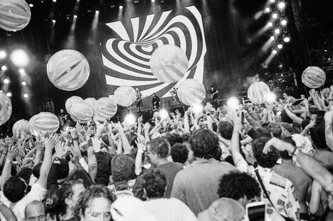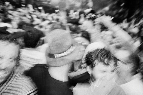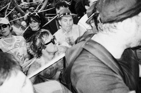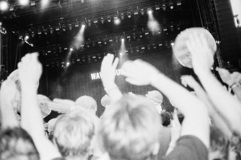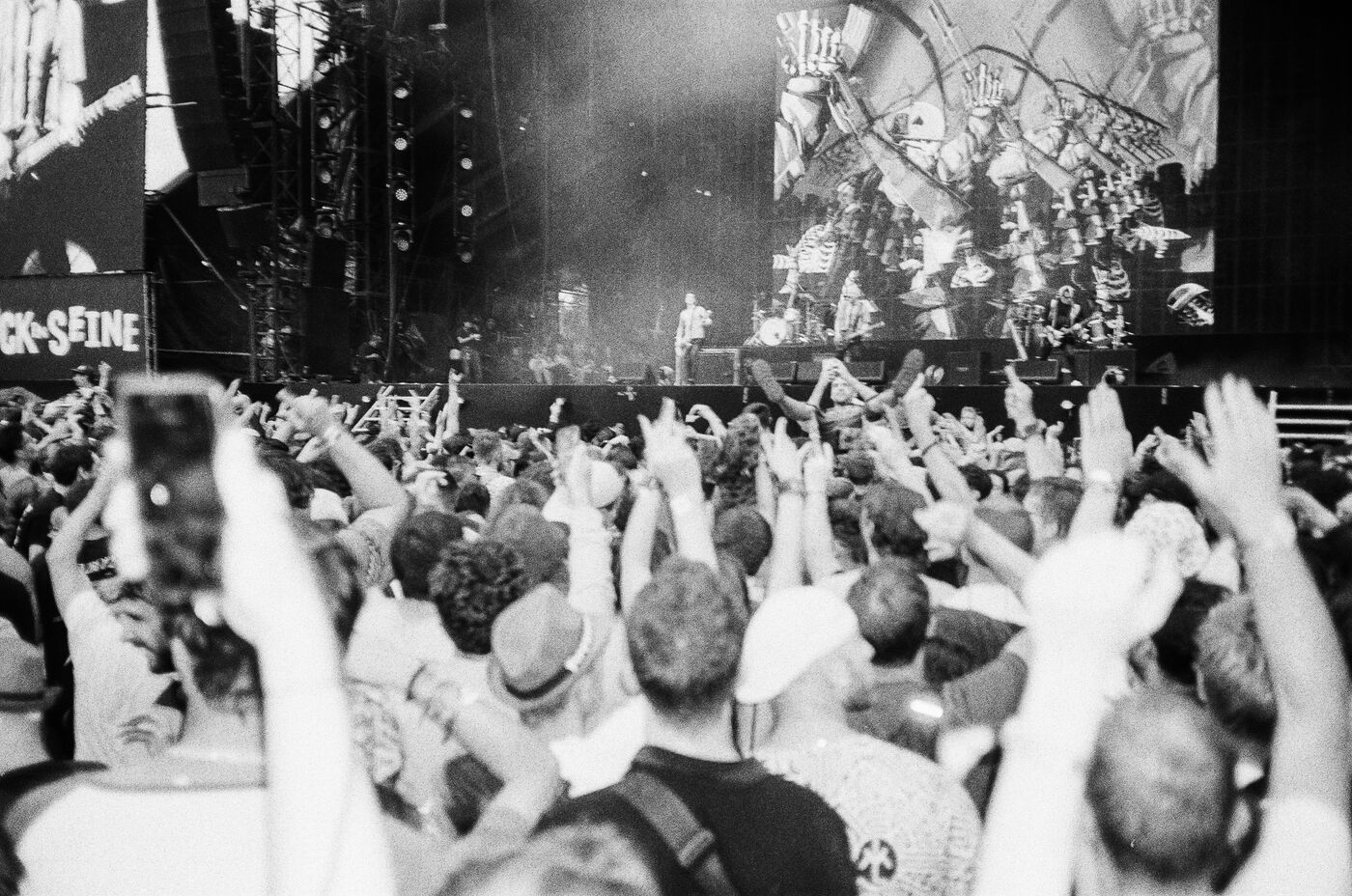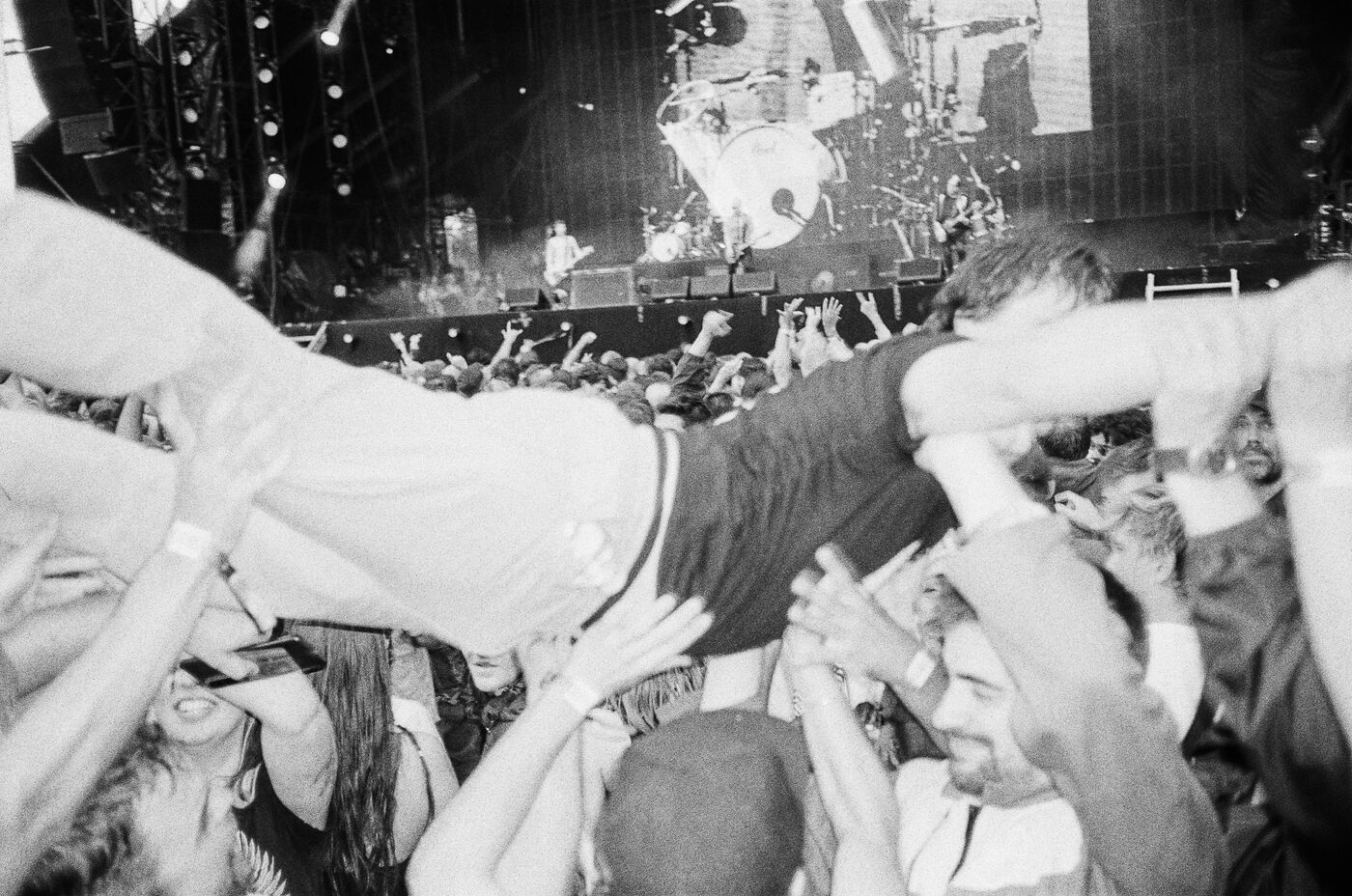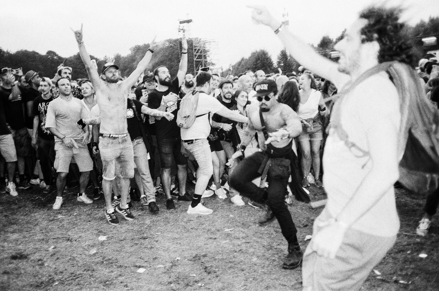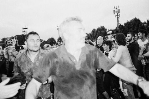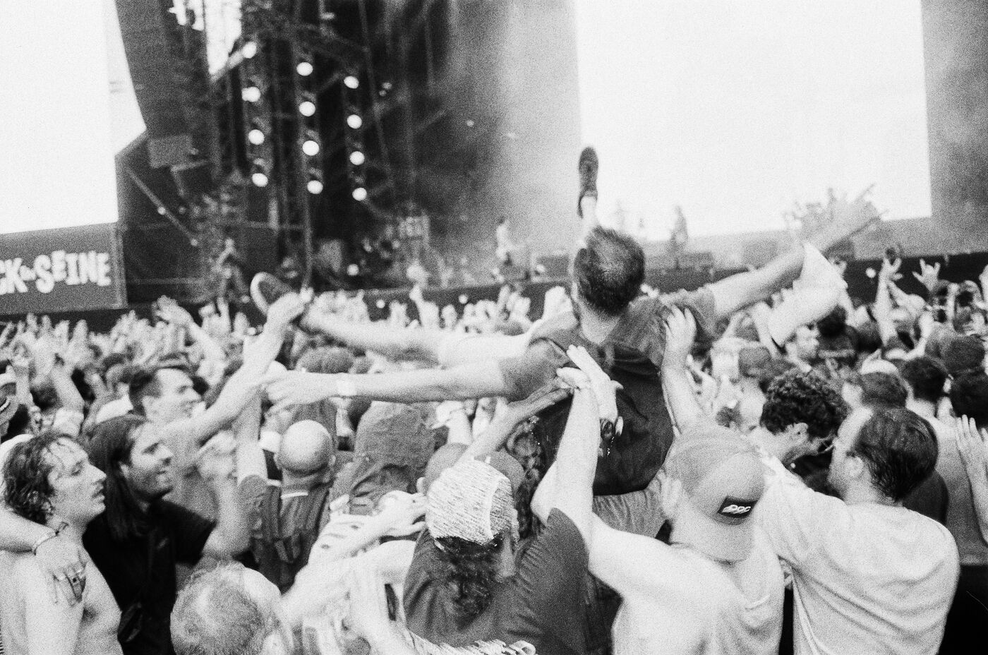 In the middle of a pogo with Festival-goers during a concert by American punk rock band The Offspring at the Rock en Seine festival at the Domaine National in Saint Cloud, France on August 24, 2024. Black and white photograph, Sunbath Double X silver film, Olympus Mju II camera.