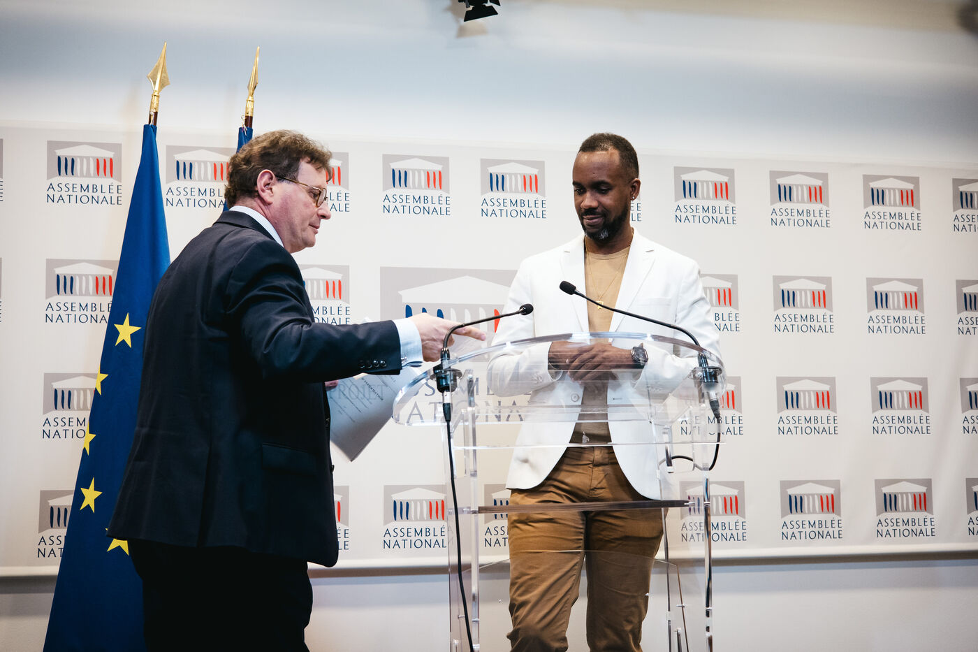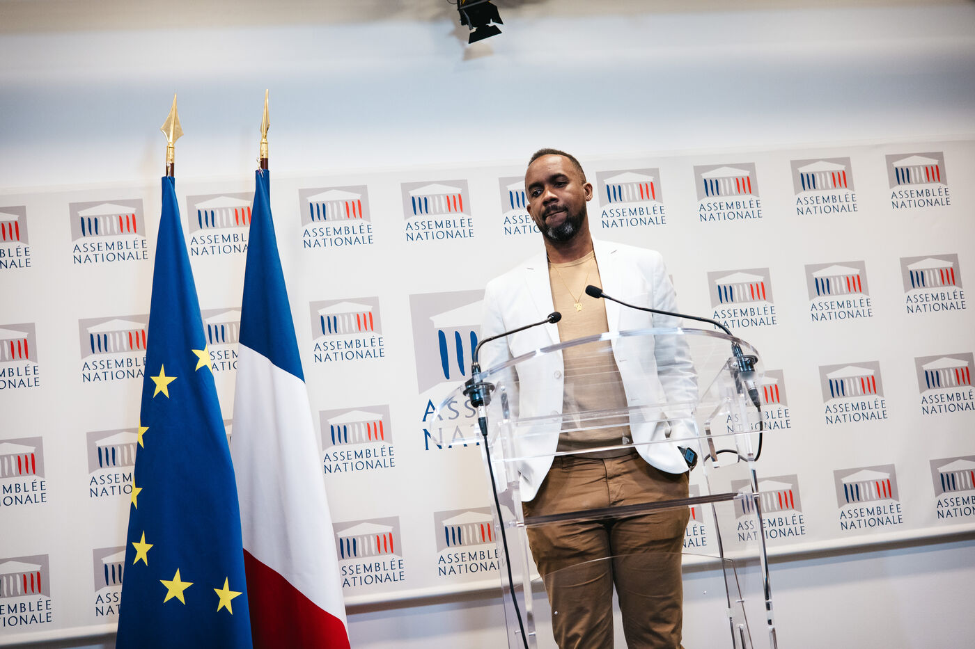 Presentation by co-rapporteurs Davy Rimane (elected member for Guyane, GDR Democratic and Republican Left Group, Communist Left, NFP New Popular Front) and Philippe Gosselin (elected member for La Manche, DR Republican Right) of the information report on the institutional future of overseas France (DOM TOM / DROM COM, overseas territories), press conference room of the National Assembly in Paris, France on January 15, 2025. Institutions present in the overseas territories and their characteristics, France's colonial past (french colonies).