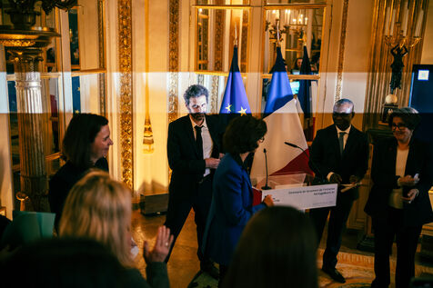 Lancement de l’initiative Heritage Watch A.I. en marge du Sommet pour l'action sur l'Intelligence Artificielle, au ministère de la Culture à Paris, France le 10 Février 2025. Signature d'un partenariat unique entre l'Alliance internationale pour la protection du patrimoine dans les zones en conflit (ALIPH), l'entreprise Microsoft, la société d'imagerie satellite Planet et la startup pionnière du patrimoine numérique Iconem.