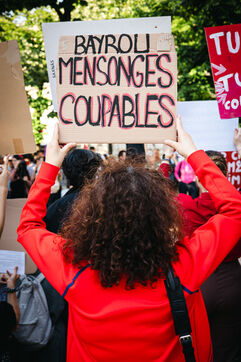 Gathering of feminist and children's associations and groups in support of children who are victims of violence on the esplanade des Invalides during the hearing of France's Prime Minister Francois Bayrou by the deputies of the commission of enquiry into the methods used by the State to control and prevent violence in schools, a hearing into acts of violence at the Notre-Dame de Betharram private school (a Catholic establishment) at the National Assembly in Paris, France on May 14, 2025.