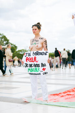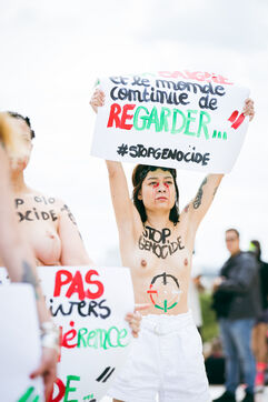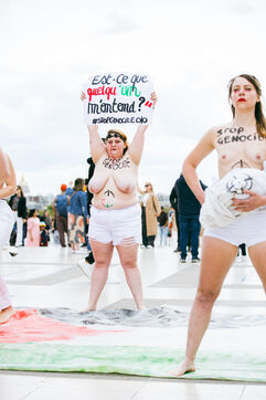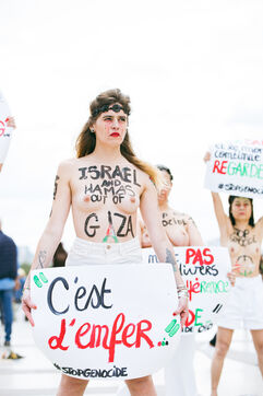 Action by FEMEN activists on the Human Rights Parvis (Place du Trocadero) in support of the Palestinian and Gazan population to alert and denounce the situation in Palestine and especially in Gaza (genocide committed by the Israeli army in retaliation for the terrorist attacks of 7 October 2023 committed by Hamas), in Paris, France on June 8, 2025. The topless demonstrators held up placards and shouted the slogans ‘Israel and Hamas out of Gaza, Stop genocide, We stand with Gaza’, before spraying themselves with fake blood and falling to the ground to illustrate the thousands of civilians who have died in this war (Israeli-Palestinian conflict).