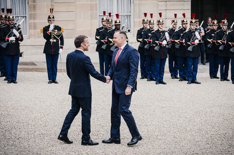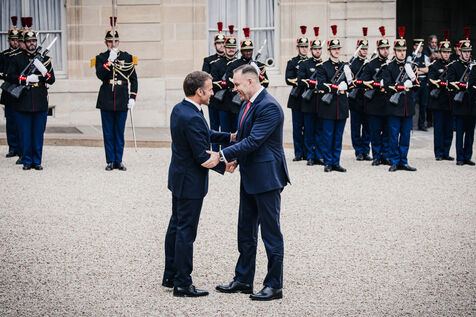 France's President Emmanuel Macron welcomes Poland's President Karol Nawrocki before their bilateral meeting at the Presidential Palace in Paris, France on September 16, 2025.