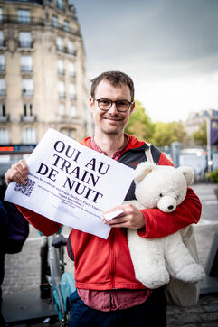 Manifestation sur le parvis de la Gare de l'Est sous forme d'un rassemblement pyjama party pour le maintien des trains de nuit, selon le collectif d'usagers "Oui au train de nuit", les trajets Paris-Vienne et Paris-Berlin nocturnes pourraient disparaître faute d'une subvention de l'Etat à Paris, France le 26 Septembre 2025.