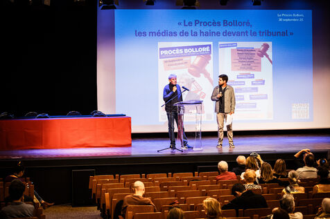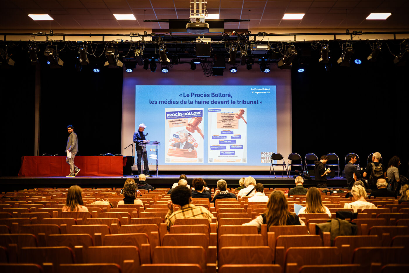 Évènement "Procès Bolloré, les médias de la haine devant le tribunal", procès symbolique parodique organisé par Le Fonds pour une Presse Libre (pour une presse libre et indépendante), sous la forme d'une réunion publique à l'Espace Reuilly à Paris, France le 30 Septembre 2025. Témoignages de journalistes lauréats du FLP sur les coulisses de leurs enquêtes sur l’extrême-droite, sa galaxie et ses relais, puis mise en scène d'une audience judiciaire à partir de chefs d’accusation inédits contre les idées d'extrême droite propagées par les médias du groupe Bolloré (C8, CNEWS, Europe 1, Le Journal du Dimanche - JDD, etc).