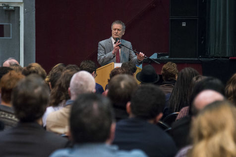 Réunion publique d'information et d'échange sur le projet d'aménagement de la ZAC du Triangle de Gonesse conduit par Grand Paris Aménagement, organisée par le commissaire enquêteur Bruno Ferry-Wilczek. Gonesse, France - 31 janvier 2018.