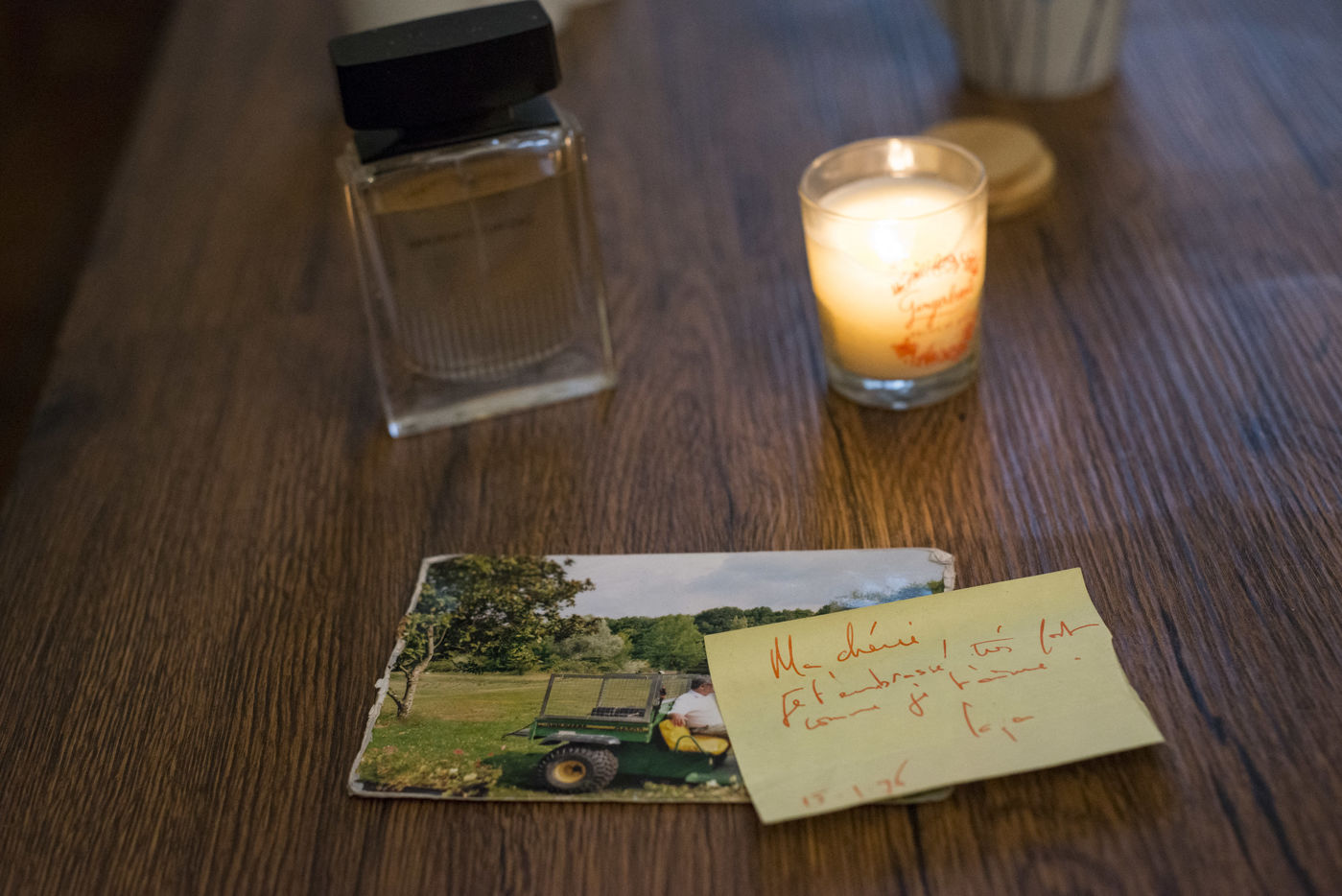 « Il a fallu s'occuper de l'héritage, se répartir tous ses objets, ses habits. Ca n'a pas été simple, je voulais tout garder. Mais j'ai réussi à passer de 10 cartons à un seul ! Il y a des choses que je garde absolument : sa polaire et une de ses chemises. Je les ai chez moi, je peux les mettre quand j'en ai envie, besoin. J'ai son parfum aussi, quand j'ai besoin de me reconnecter à lui je met un pschitt. Mais le temps faisant, j'y pense beaucoup moins. »