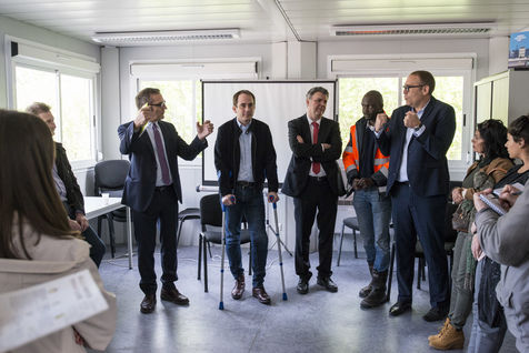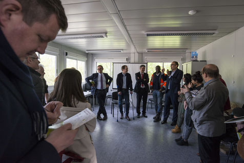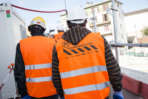 Chantier pour les travaux de la future station La Dhuys à Montreuil, dans le prolongement de la ligne 11 du métro. L'ouverture de la station est prévue pour fin 2022 : Chatelet ne sera plus qu'à 21 minutes contre près d'une heure actuellement. Une visite pour les élus de la ville ainsi q'une vingtaine de riverains a été organisée par la RATP. Vue sur le puit, avant l'arrivée du tunnelier l'année prochaine. Le puit mesure 36 mètres de diamètre, à 25 mètres sous le niveau de la terre. Montreuil, France - le 27 avril 2018.
