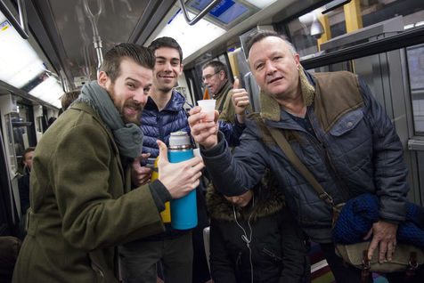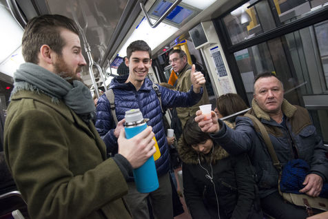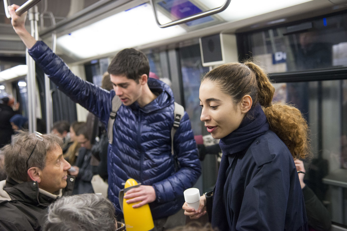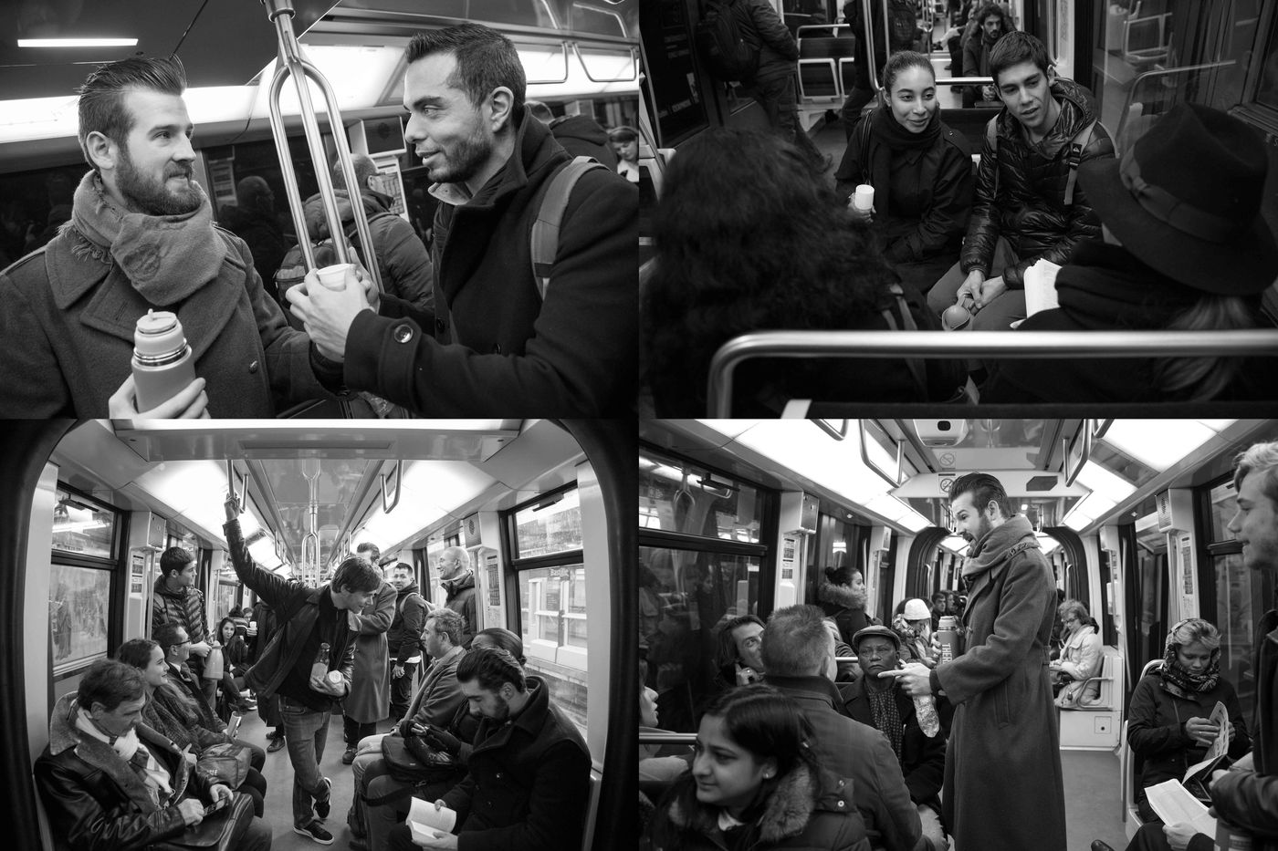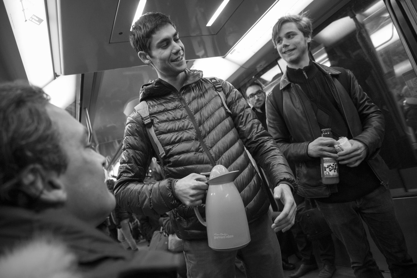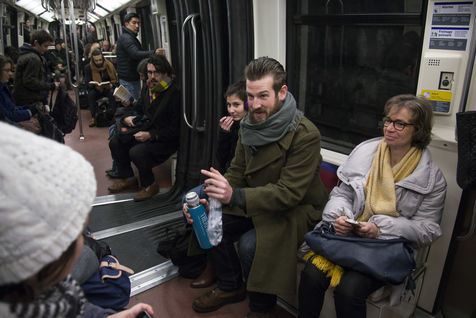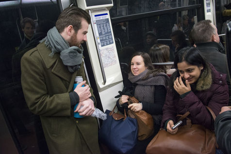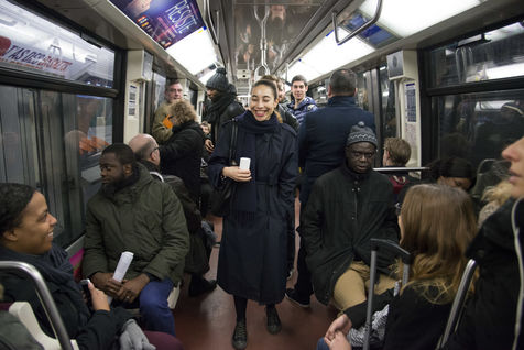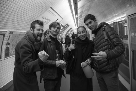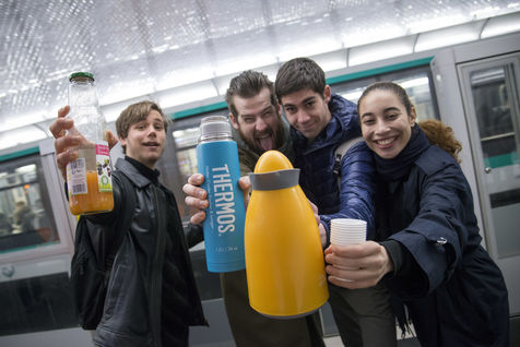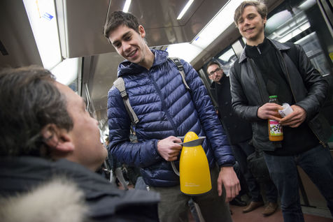 8h30, sur le quai de la ligne 1, quelques jeunes se retrouvent, sourires aux lèvres. Comme tous les lundis matins ils vont distribuer du café, du thé ou des jus aux usagers du métro sur la route du travail avant d'aller eux-mêmes travailler. Cette initiative citoyenne est née de l'envie de faire 'tomber les masques', d'aller à la rencontre des autres, de faire sourire les gens dans le métro et rapprocher les parisiens, en octobre 2015. Leur énergie communicative tout au long de la ligne se ressent, et si certains s'étonnent de cette initiative totalement altruiste, la plupart sont bien contents que leur trajet quotidien s'anime.