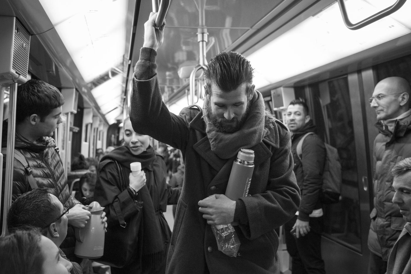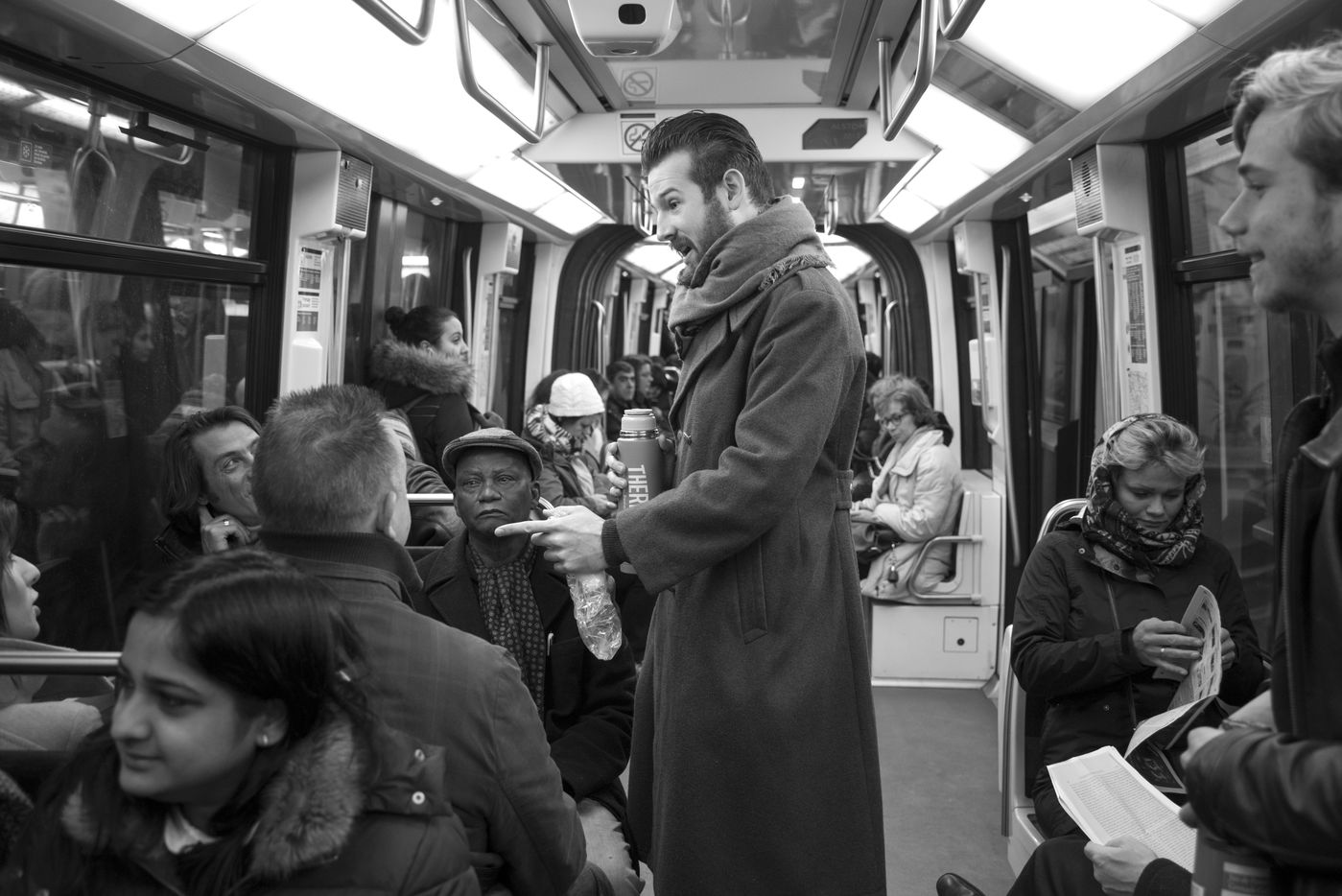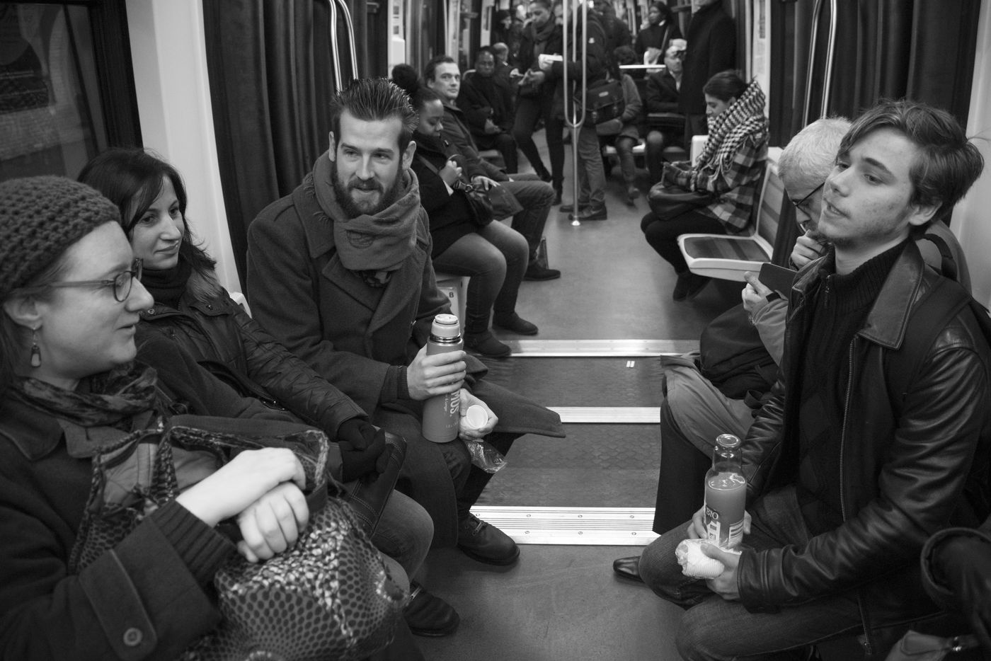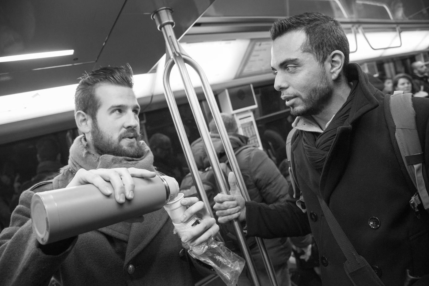 8h30, sur le quai de la ligne 1, quelques jeunes se retrouvent, sourires aux lèvres. Comme tous les lundis matins ils vont distribuer du café, du thé ou des jus aux usagers du métro sur la route du travail avant d'aller eux-mêmes travailler. Cette initiative citoyenne est née de l'envie de faire 'tomber les masques', d'aller à la rencontre des autres, de faire sourire les gens dans le métro et rapprocher les parisiens, en octobre 2015. Leur énergie communicative tout au long de la ligne se ressent, et si certains s'étonnent de cette initiative totalement altruiste, la plupart sont bien contents que leur trajet quotidien s'anime.