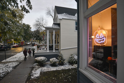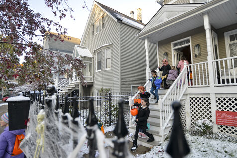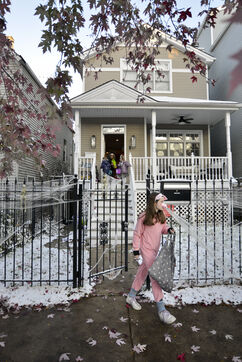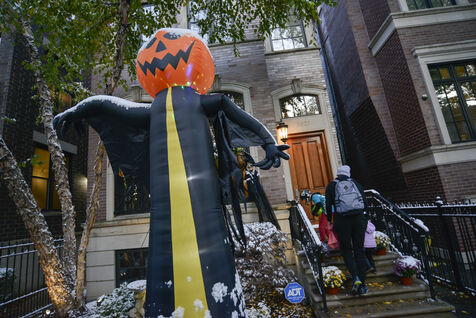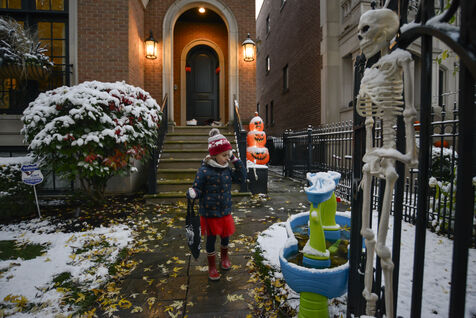 Dès le début du mois d'octobre les décorations sont installées et le soir du 31, les enfants se déguisent et font le tour des maisons pour récolter des bonbons. Cette année il a neigé à Chicago, l'ambiance est hivernale.