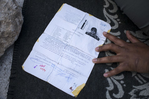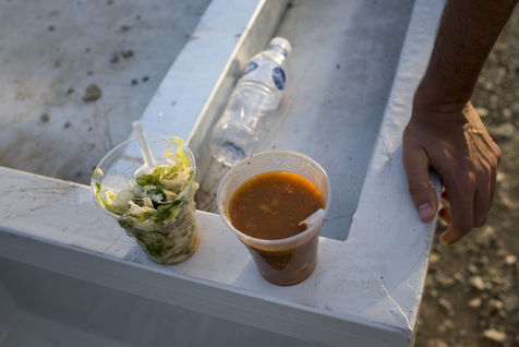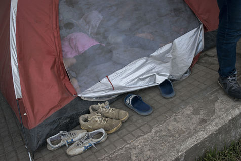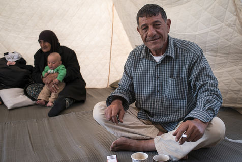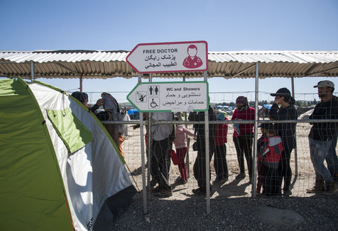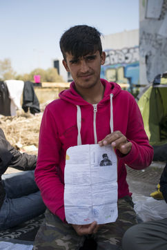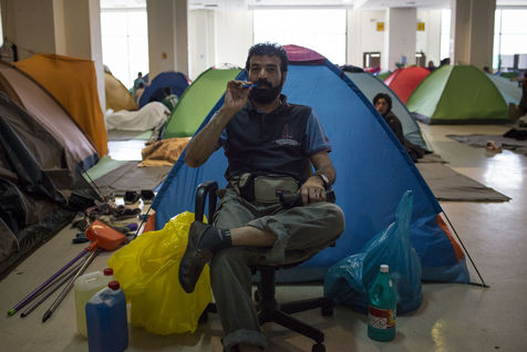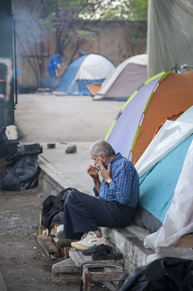 Nous rencontrons Najar, une vieille femme syrienne, qui tente de rejoindre son mari et son fils en Allemagne, avec sa belle-fille et son petit fils de six mois. Elle nous présente le seul document officiel qu'elle possède, récupéré lors de son arrivée en Grèce. Elle a fuit la Syrie en guerre et sa ville Deir Ez-Zor, abandonné leur boutique pour faire la route, malgré son asthme et les difficultés liées à son âge. Elle vient de récupérer son petit-déjeuner lors d'une distribution : un oeuf, une tomate, une bouteille d'eau, une orange, un petit pain. Il lui aura fallu une heure pour le récupérer. Une heure d'attente, alignés les uns derrière les autres, à piétiner le sol. L'attente est continue dans les camps. Différentes distributions se mettent en place et chaque réfugié pourrait passer ses journées dans les files d'attente, pour récupérer un repas, une paire de chaussures pour les enfants, voir un médecin, attendre, attendre, attendre. La journée, Najar partage une grande tente avec sa belle-fille, un autre jeune couple et Yassine. Comme un salon improvisé. Yassine est un ancien fermier syrien. Il cherche à rejoindre Stuttgart où une partie de sa famille vie désormais. Il nous invite à prendre le café, toujours une cigarette à la main.