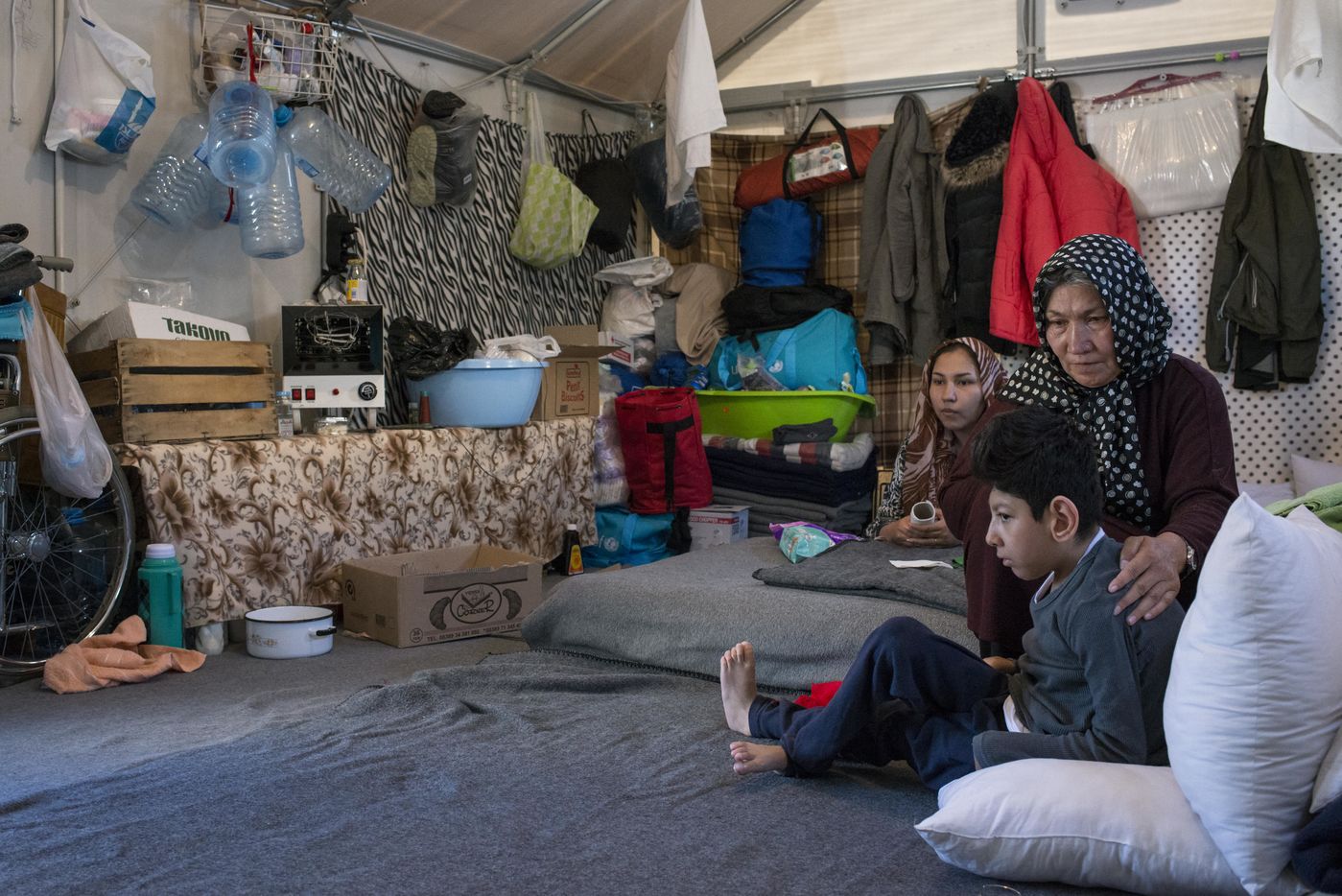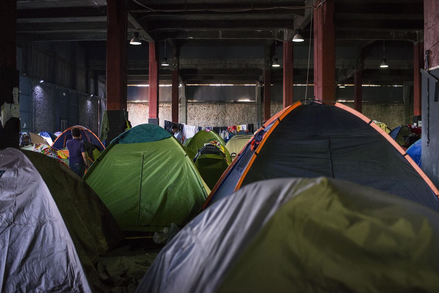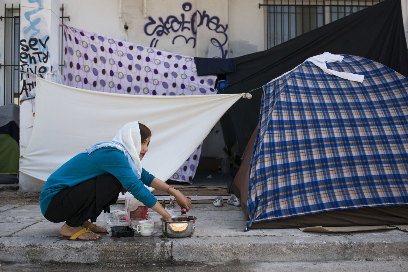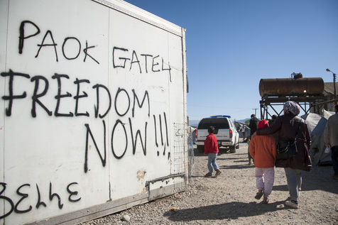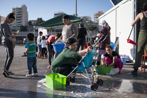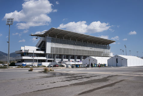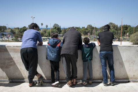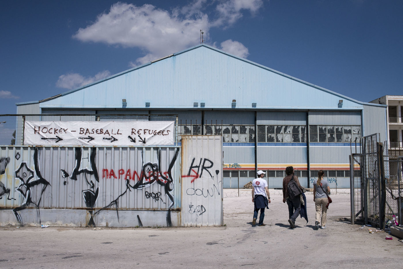 Dans la banlieue d'Athènes, sur le bord de mer, l'ancien aéroport et les stades construits pour les Jeux Olympiques de 2004, ont été transformés en centres d'accueil pour les 4000 réfugiés venus d'Afghanistan, de Syrie, d'Iran ou d'Irak pour la plupart. Dans les tribunes, à l'intérieur mais aussi en dehors des batiments, les tentes s'entassent. L'intimité est quasi inexistante. Dans un entrepôt de stockage sont amassés des centaines de cartons : couches, chaussures, vêtements, nourriture, hygiène... Des toilettes et des douches souvent très sales, sont installés dehors, sous la chaleur du printemps. Quelques volontaires organisent des jeux avec les enfants. Le quotidien est rythmé par les distributions de repas, parfois gérés par des associations internationales, parfois par le gouvernement grec. Mais c'est l'attente qui prédomine, l'attente de pouvoir avancer vers la nouvelle vie qu'ils espèrent.