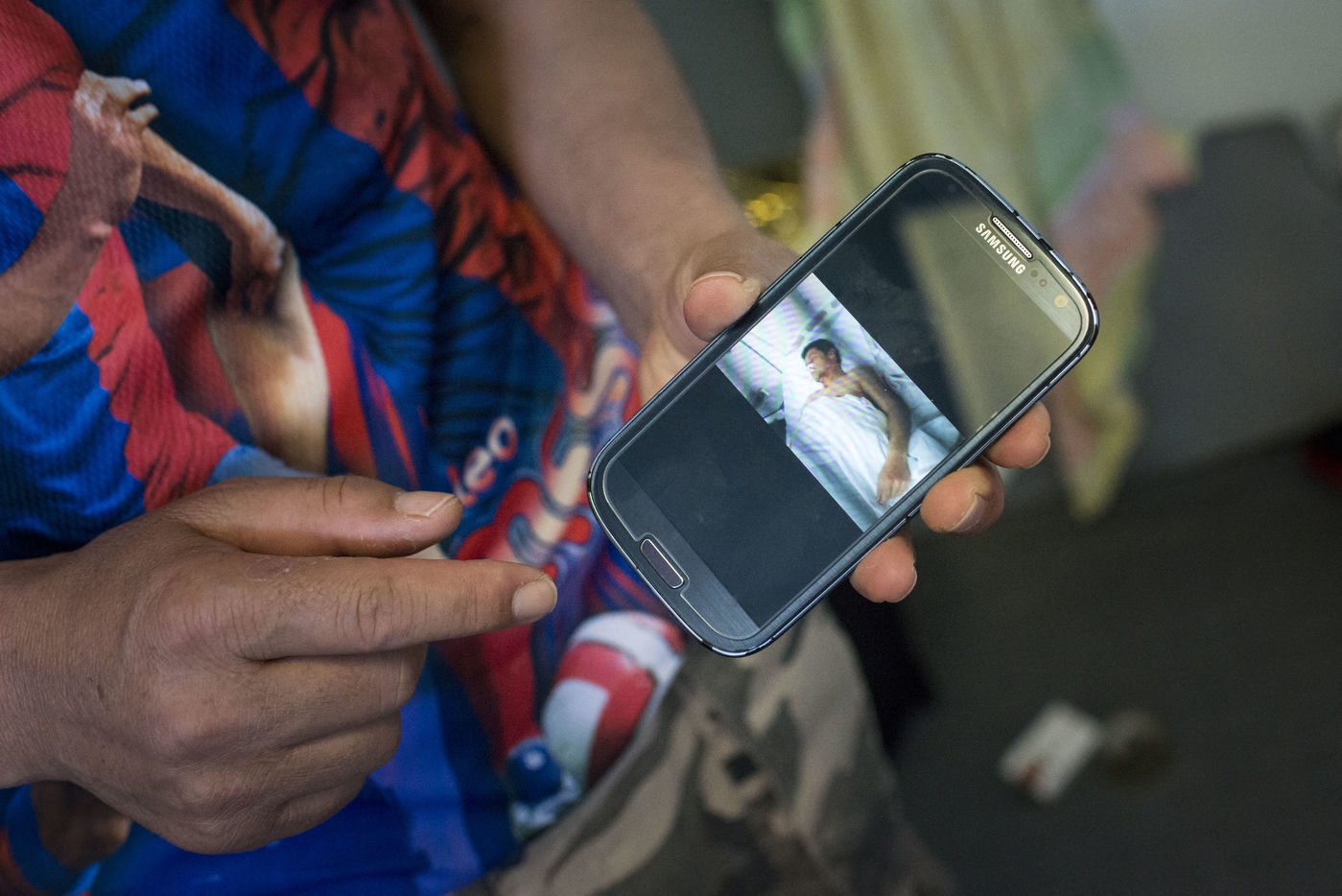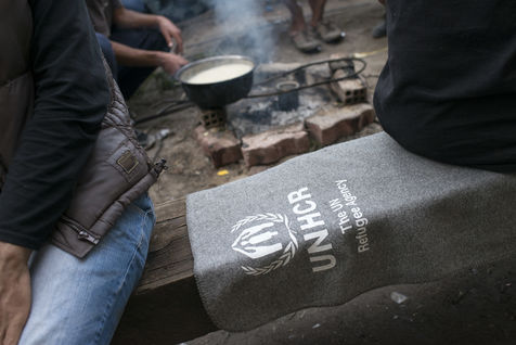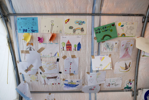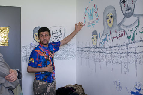 Il y a Jamil, 18 ans, le taggueur aux yeux verts. Et son copain Aliarghan, 16 ans, qui est ici avec son oncle et son frère, le reste de sa famille étant resté en Afghanistan. Ce dernier maitrise l'anglais et nous amène voir son oncle Ghulam, le dessinateur, qui semble fatigué, épuisé. Et triste. Sur les murs de la toute petite pièce qu'il occupe avec sa famille, cet homme a dessiné sa peine : des afghans, lui, sa femme et son fils, pleurent derrière des barbelés. Et puis le logo du Haut Commissariat aux Réfugiés (UNHCR), revu avec son interprétation : les mains de l'ONU qui protège habituellement le personnage au centre du dessin bleu, sont détournées et l'excluent. Ils sont allés jusqu'à Idomeni pour continuer leur route, mais la police les a repoussés à coups de crosse, et il a du se faire opérer suite à une hémorragie.