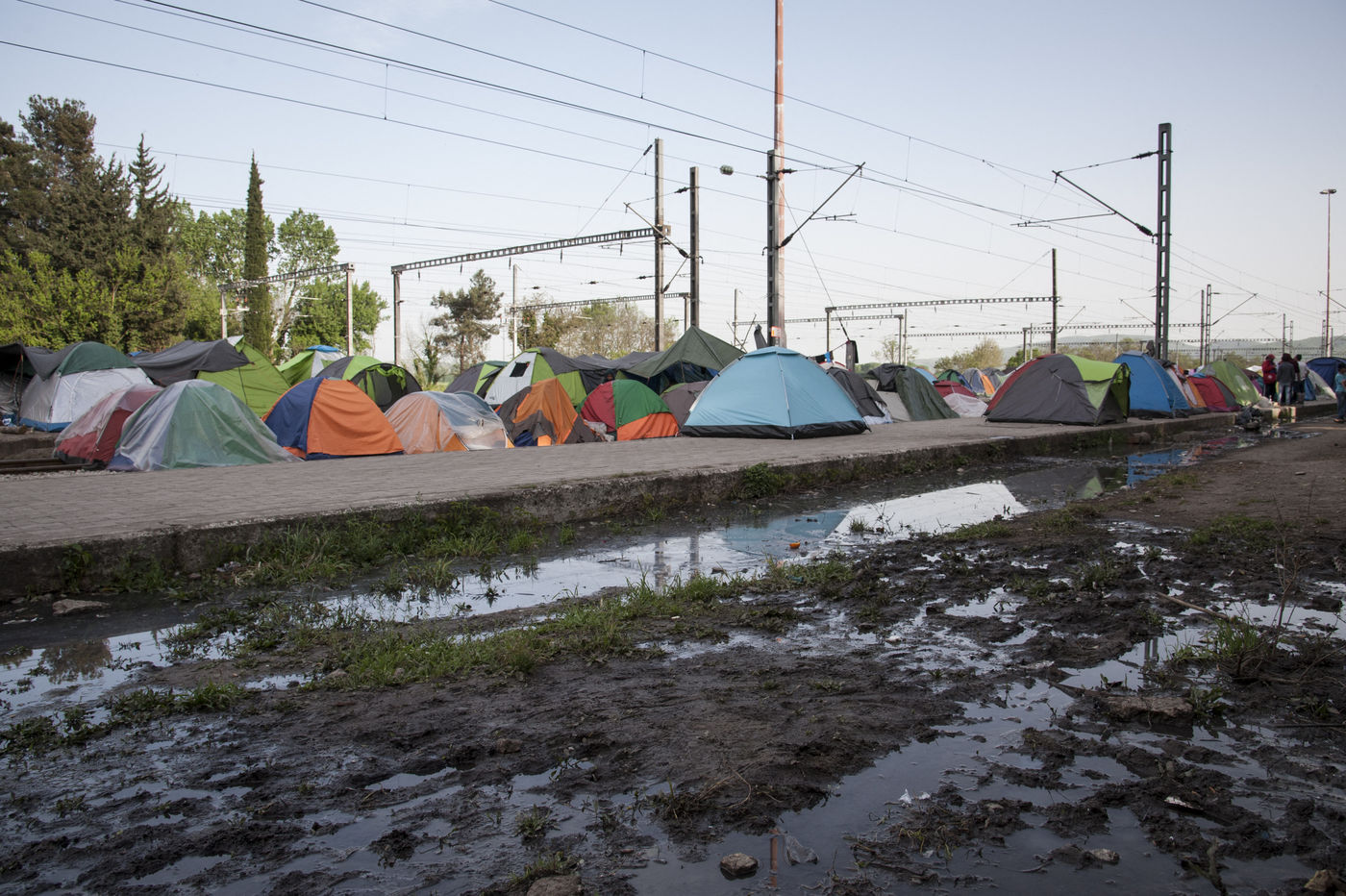 Pendant notre séjour le temps est venteux mais clément, et on remarque encore de vastes étendues boueuses, signes d'une période de pluie difficile. Maintenant c'est la chaleur qui guette les réfugiés, la chaleur écrasante de l'été qui arrive. Les points d'eau sont bouchés pour la plupart et l'eau stagnante n'augure rien de bon dans de telles conditions. Les tentes ont envahi la vieille gare d'Idomeni et le camp s'étend sur plusieurs kilomètres. Un plan a même été mis en place pour pouvoir s'y retrouver, identifier les emplacements de douches, de latrines, de tentes de soins, les distributions etc. Nous croisons beaucoup de très jeunes enfants et de nourrissons, des femmes enceintes également. Si des distributions de lait et autres produits pour bébés sont mises en place, si des médecins sont présents tous les jours, il n'est pas toujours évident d'y avoir accès et les soins doivent être continus et attentionnés. Aujourd'hui l'urgence de l'aide à apporter doit aussi être orientée vers ce public. La naissance et l'éducation doivent être protégées.