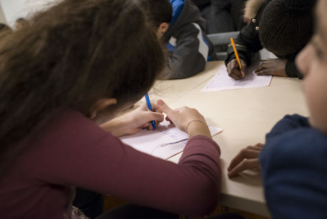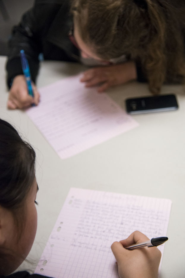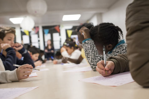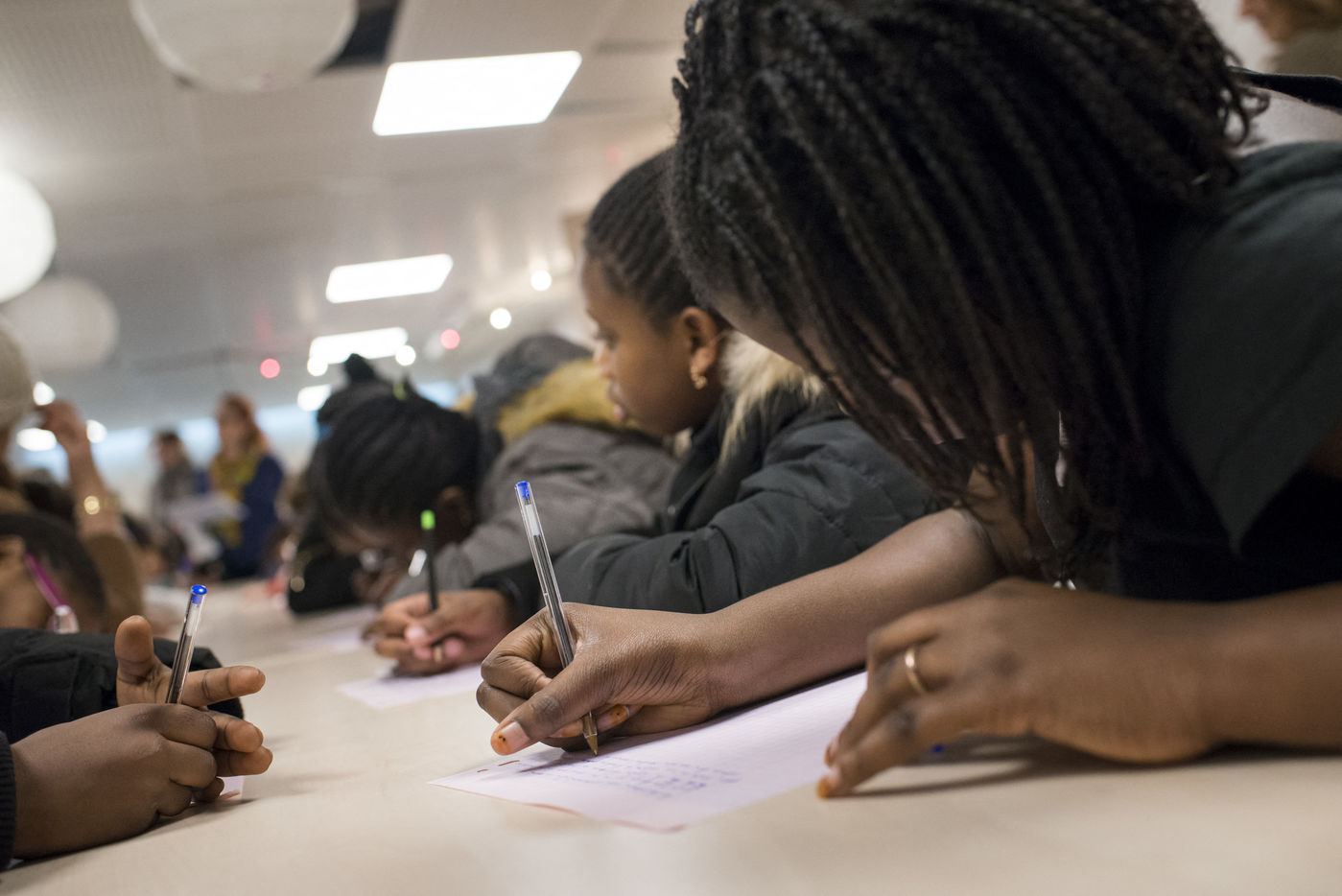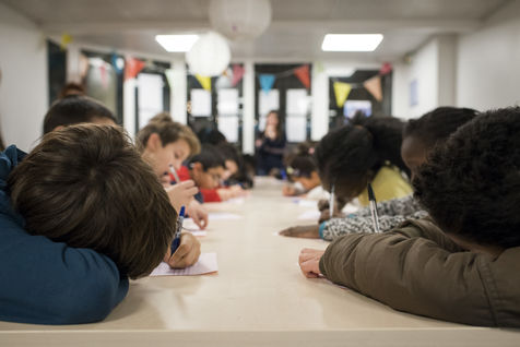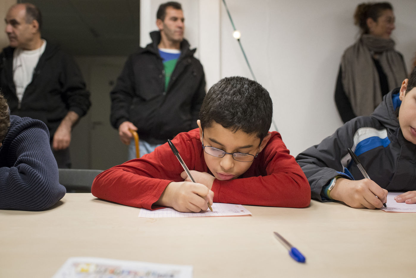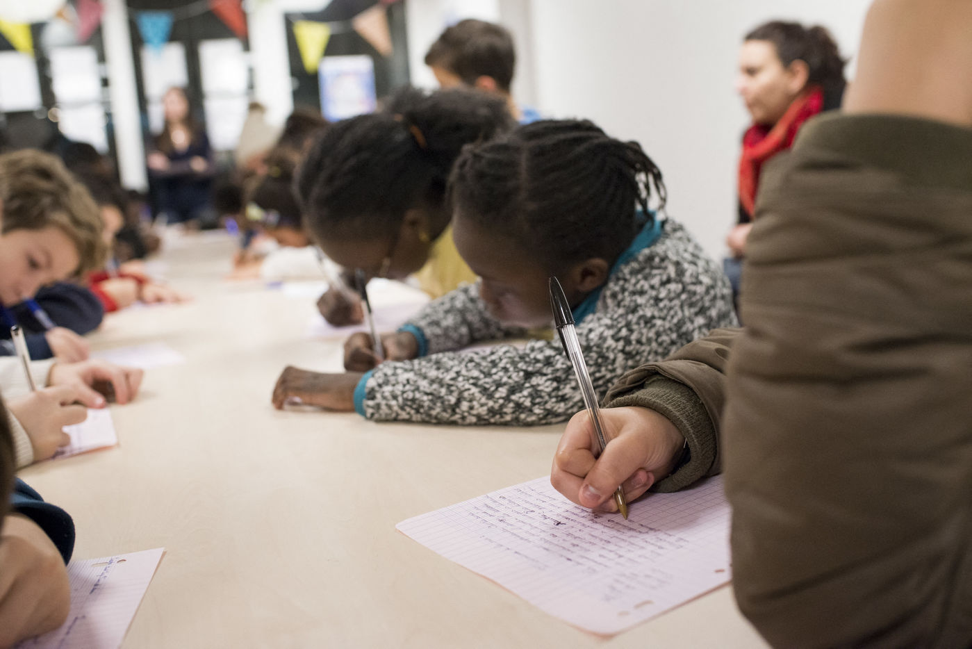 La Grande Dictée, dictée pour plusieurs niveaux et catégories d'âges, dans le cadre du festival Lire en Délire organisé par la mairie du 11e arrondissement de Paris en partenariat avec des associations. Rue Robert Houdin, Paris, France - Mercredi 16 novembre 2016.