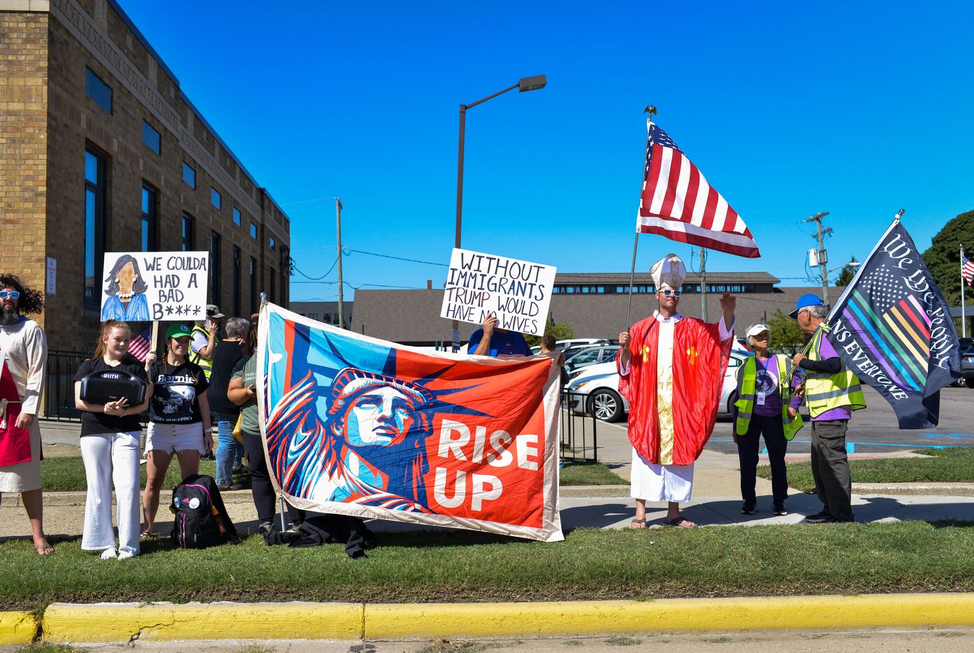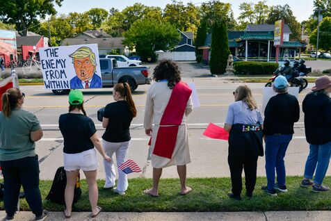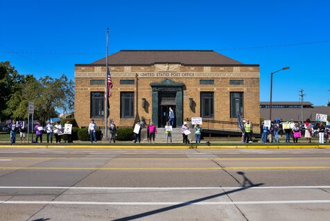 États-Unis, South Haven, Illinois, 2025-08-30. Plusieurs citoyens américains se sont rassemblés devant le bureau de poste de South Haven pour protester contre la politique de Donald Trump, notamment concernant ses choix et actions en matière d'immigration. Il s'agissait d'une manifestation pacifique et immobile dans cette ville balnéaire au bord du lac Michigan. De nombreuses voitures klaxonnaient à leur passage pour montrer leur soutien aux manifestants.