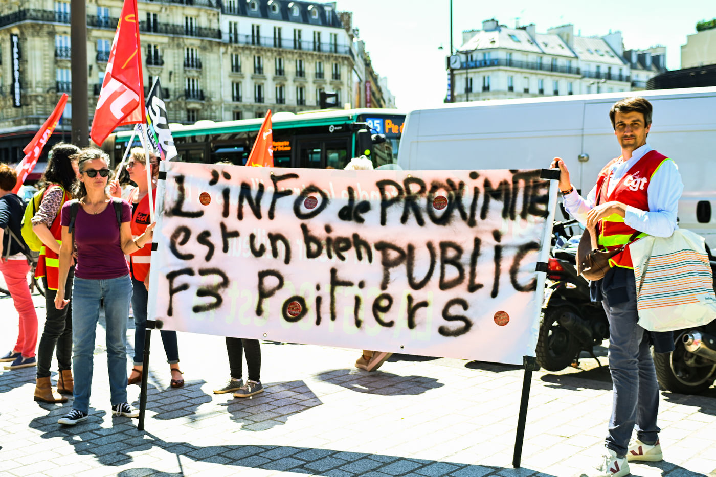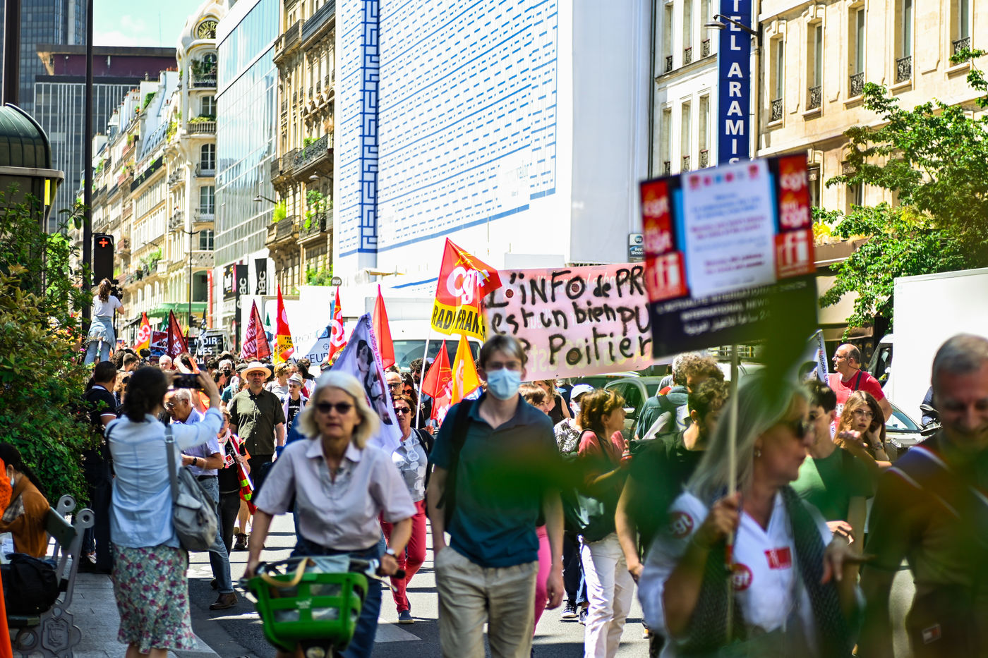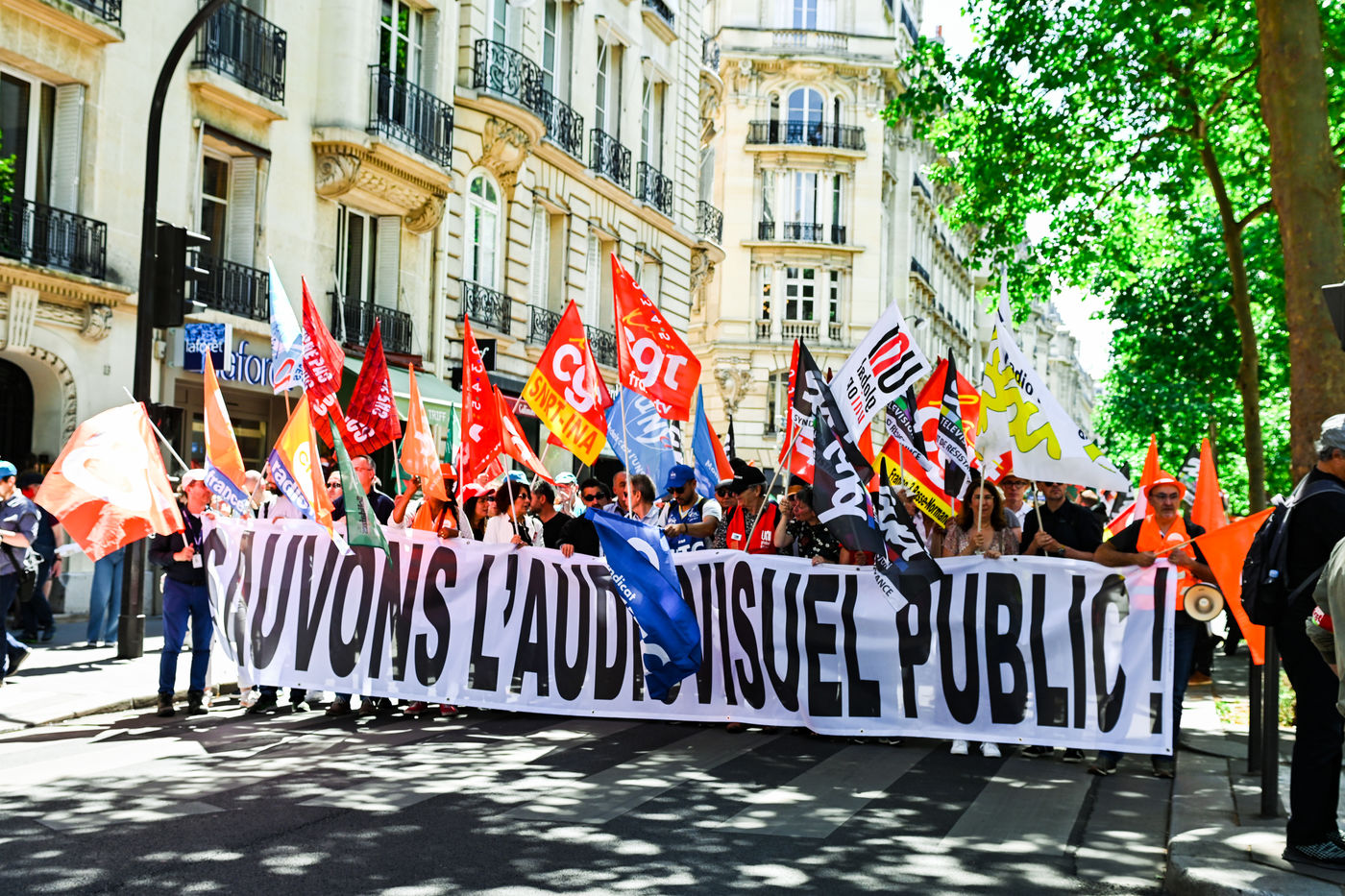 Strike and demonstration of the employees of Radio France and France Televisions against the end of the audiovisual license fee. The programs on the radio and TV were therefore disturbed.
