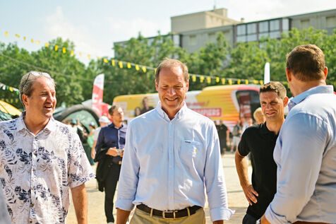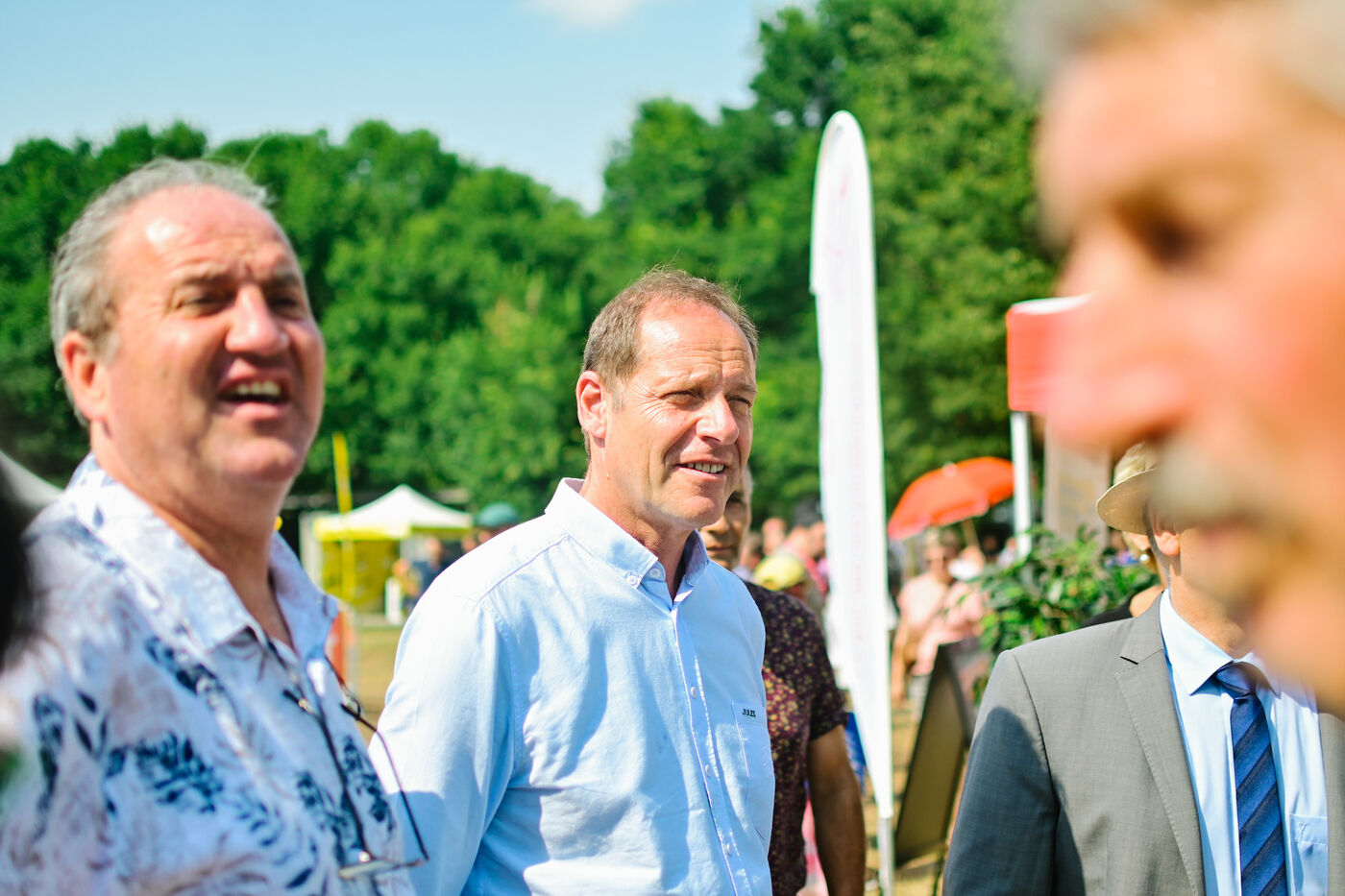 France, Clermont-Ferrand, 2023-07-10. Inauguration officielle du Fan Park de Clermont-Ferrand, situe place du 1er Mai, par Christian Prudhomme, directeur du Tour de France depuis 2007, Olivier Bianchi, maire de la ville et Philippe Chopin, Prefet du departement du Puy-de-Dome. Pendant le Tour de France, Clermont-Ferrand est l une des quatre villes a accueillir un Fan Park. Photographie par Adrien Fillon / Hans Lucas.