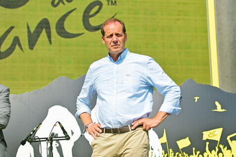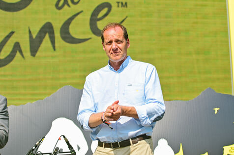 France, Clermont-Ferrand, 2023-07-10. Official opening of Clermont-Ferrand s Fan Park on the place du 1er Mai by Christian Prudhomme, general director of the Tour de France since 2007, Olivier Bianchi, Mayor of the city and Philippe Chopin, Prefect of the Puy-de-Dome department. For this 2023 Tour de France, Clermont-Ferrand is one of the four cities that welcome a Fan Park. Photograph by Adrien Fillon / Hans Lucas.