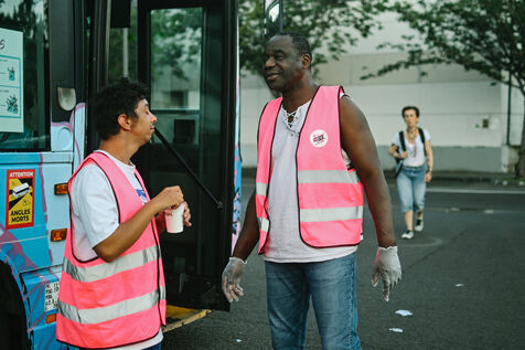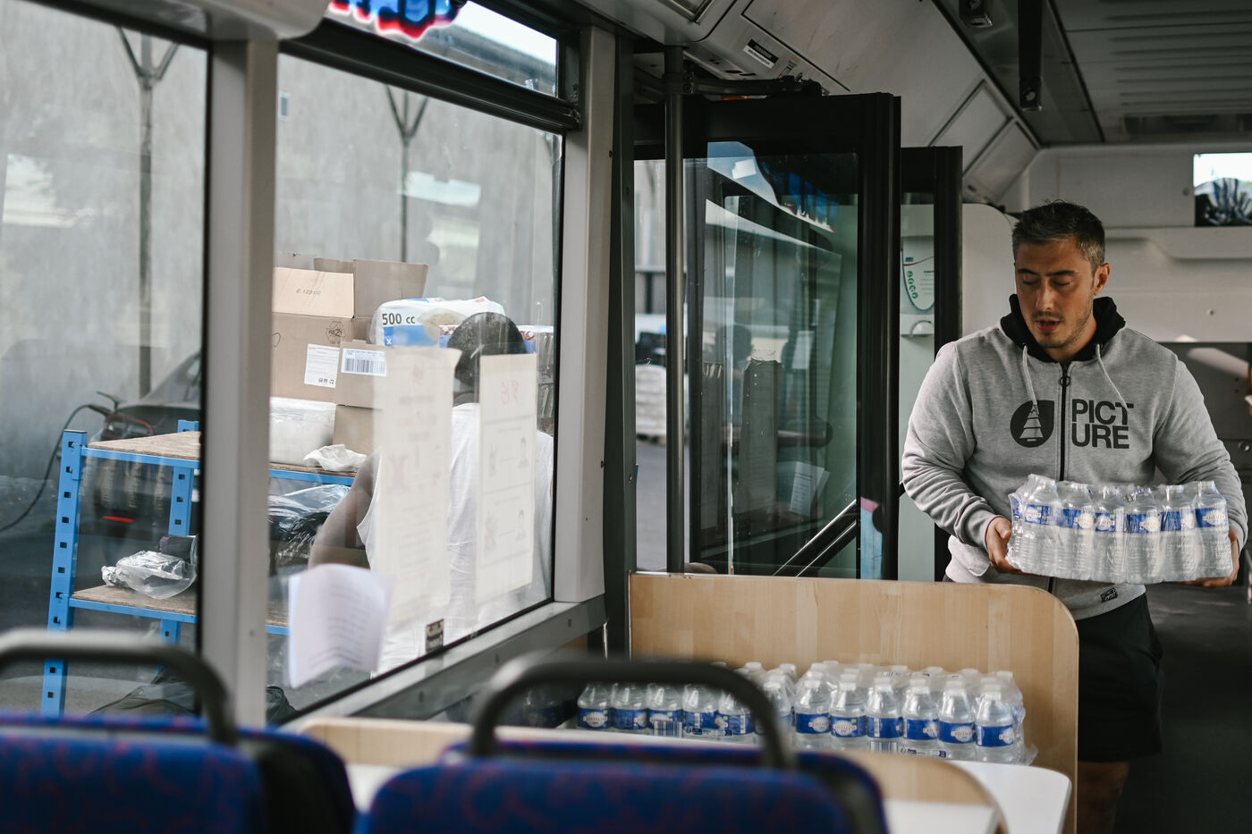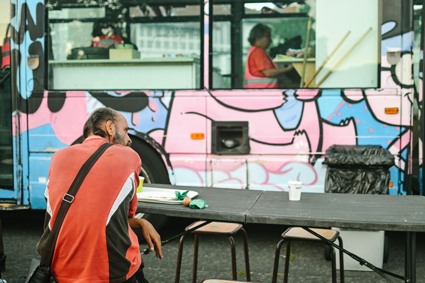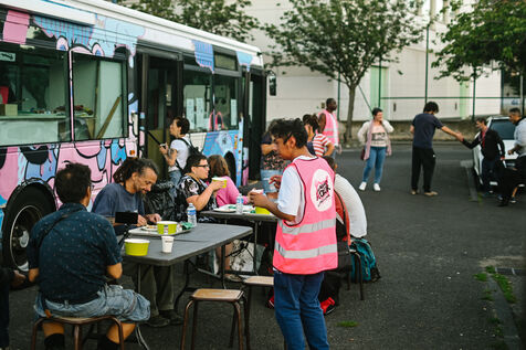 Every Tuesday evening during the summer months, a handful of volunteers from the Clermont-Ferrand branch of Restos du Coeur climb aboard the "Bus du Coeur". Filled with provisions, ready-made meals, blankets and bags, the bus makes its first stop in the north of Clermont-Ferrand, in the Fontgiève district. As soon as the tables are set up outside, the beneficiaries, smiles on their faces, sit down and share their meal. Here, the homeless mingle with those in financial difficulty (most live on RSA).
