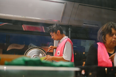 "En moyenne, on tourne à 220, 250 couverts par soir. On a doublé depuis le Covid", explique Pierre, bénévole depuis cinq ans. "Quand j'ai commencé, on en faisait 90 !", lâche Thierry, le chauffeur du bus et actuel chauffeur à la T2C (Transports de Clermont).